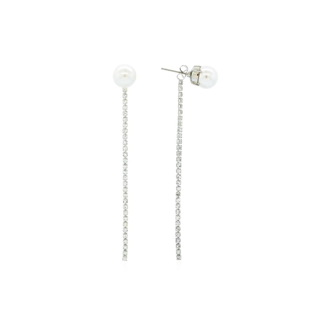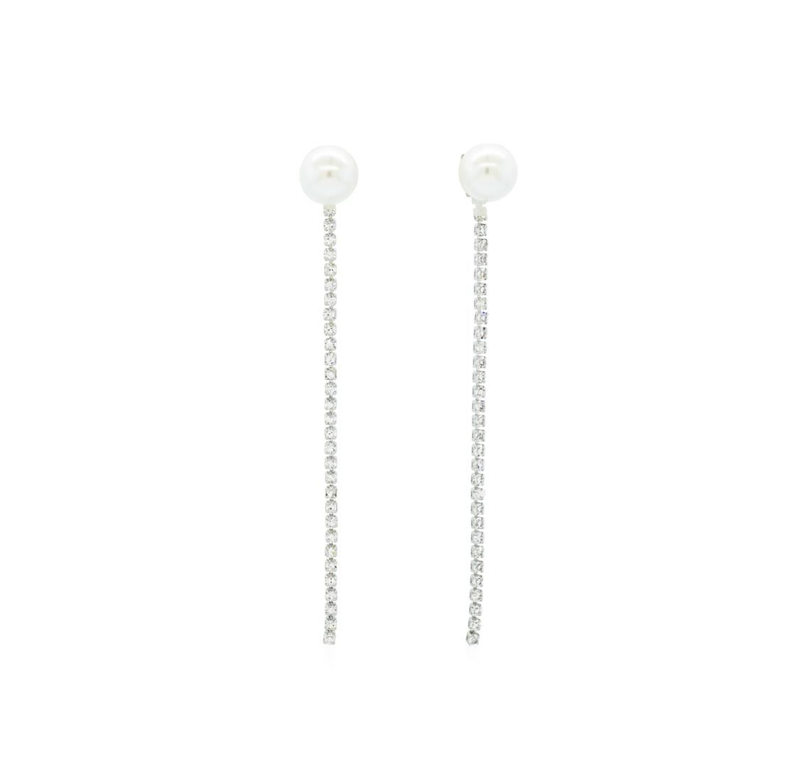 High end designer jewelry. Pearl Crystal Earrings - Rhodium Plated. Rhodium Plated. White/ Clear. 3inch..