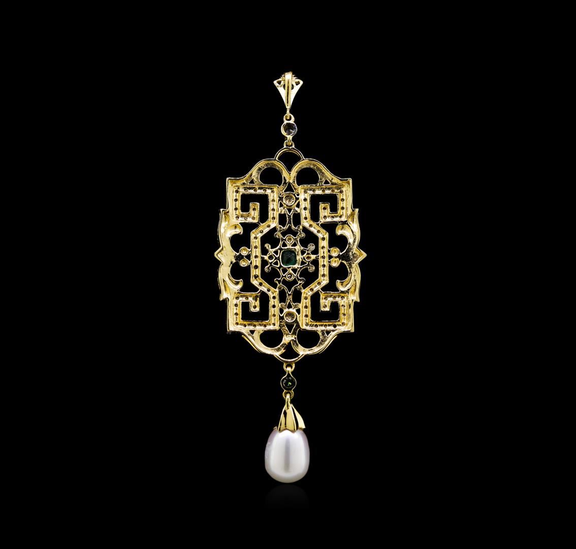 One pendant featuring: 18KT yellow gold weighing 7.80 grams containing one pearl, emeralds with a total weight of 0.27ct, and diamonds with total weight 0.45ct.