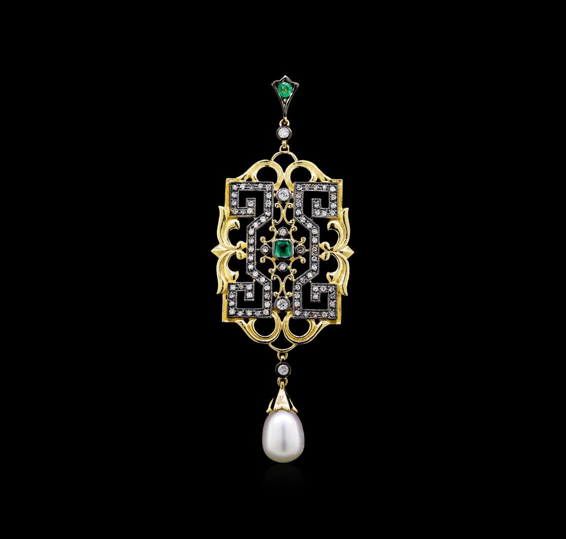 One pendant featuring: 18KT yellow gold weighing 7.80 grams containing one pearl, emeralds with a total weight of 0.27ct, and diamonds with total weight 0.45ct.