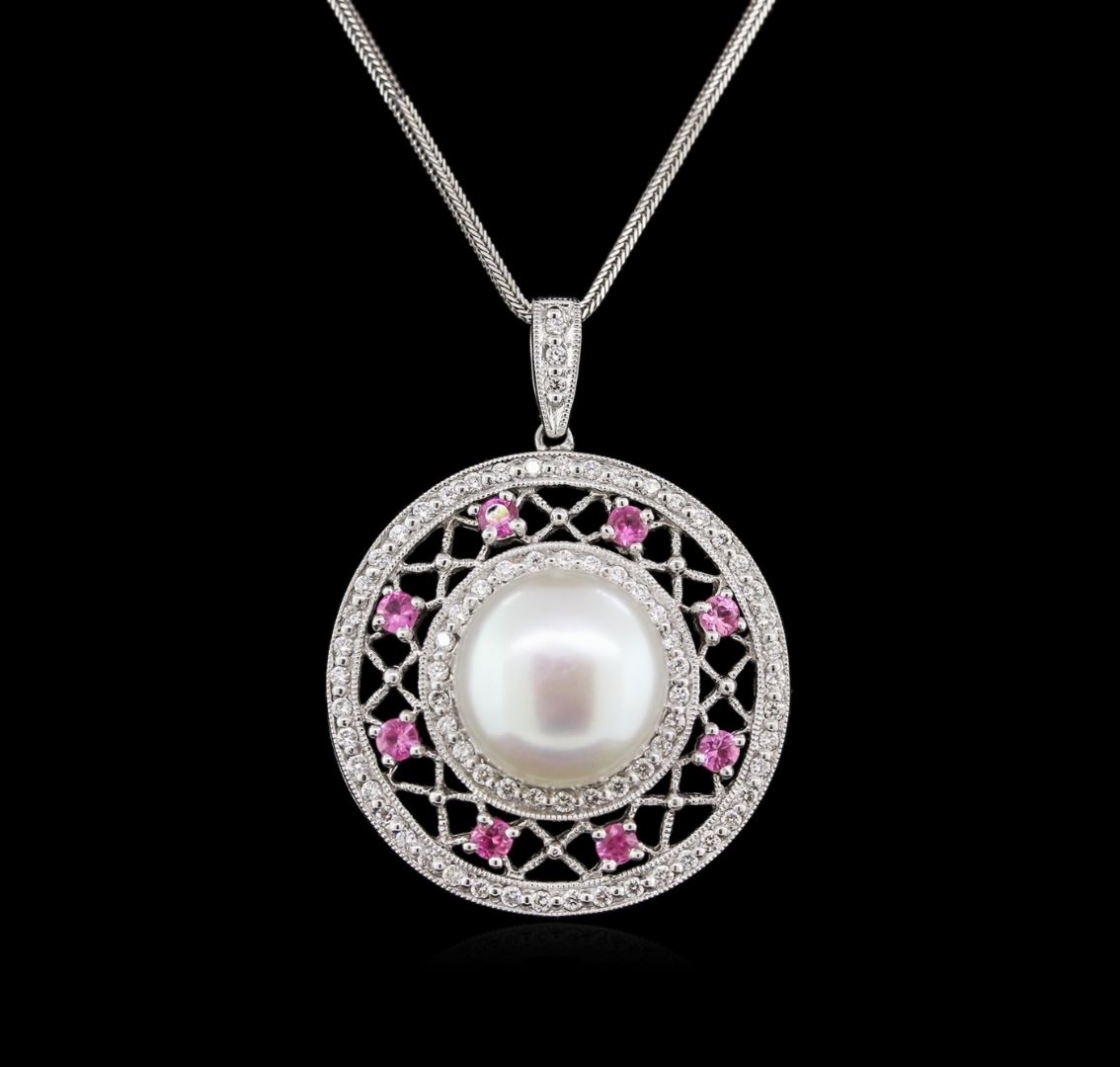 One pendant with chain featuring: 14KT white gold weighing 8.00 grams containing one pearl center stone measuring 11-12mm, pink sapphires with a total weight of 0.50ct and diamonds with a total weight of 0.48ct.