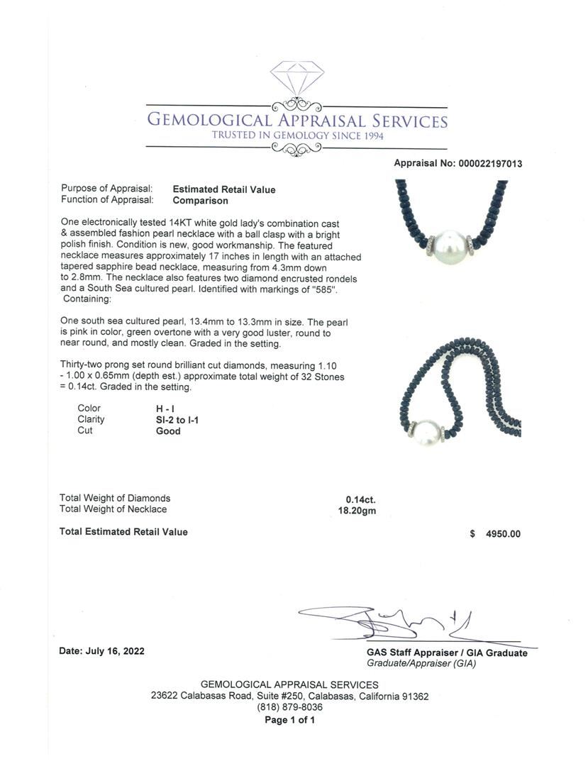 One electronically tested 14KT white gold lady's combination cast & assembled fashion pearl necklace with a ball clasp with a bright polish finish. Condition is new, good workmanship. The featured necklace measures approximately 17 inches in length with a