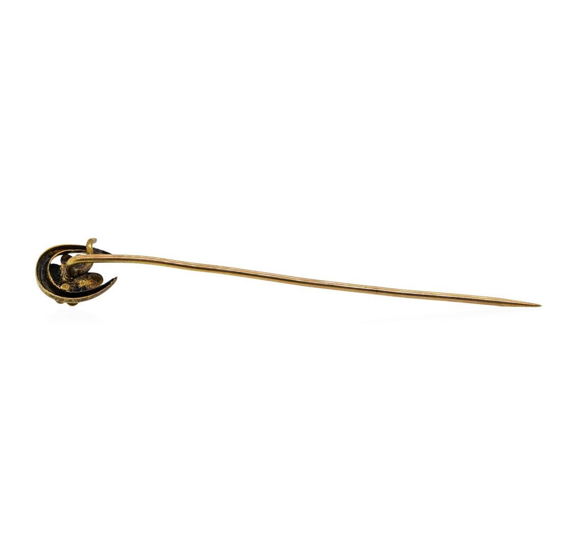One horse-shoe four-leaf clover motif stick pin featuring: 10KT yellow gold weighing 0.6 grams containing one seed pearl.
