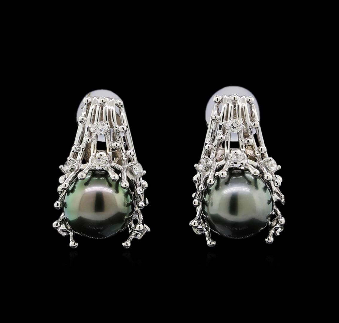 One pair electronically tested 14KT white gold lady's combination cast & assembled fashion earrings with Omega clip backs with posts with a bright polish finish. The featured lady's earrings have a freeform wire motif. Identified with markings of '14K'. Condition is new, good workmanship. Containing: Two Tahitian pearls, 11.8mm to 11.7mm in size. The pearls are black in color, green overtone with a good luster, round to near round, and mostly clean with very good matching. Graded in the setting. Twelve prong set round brilliant cut diamonds, measuring 2.30 - 2.20 x 1.40mm (depth est.) approximate total weight of 12 Stones = 0.53ct. Graded in the setting. Clarity VS-2 to SI-2. Color: G - H Cut Good. Total Weight of Diamonds 0.53ct.. Total Weight of Earrings 14.50gm. GAS Appraised at $5,680.00.