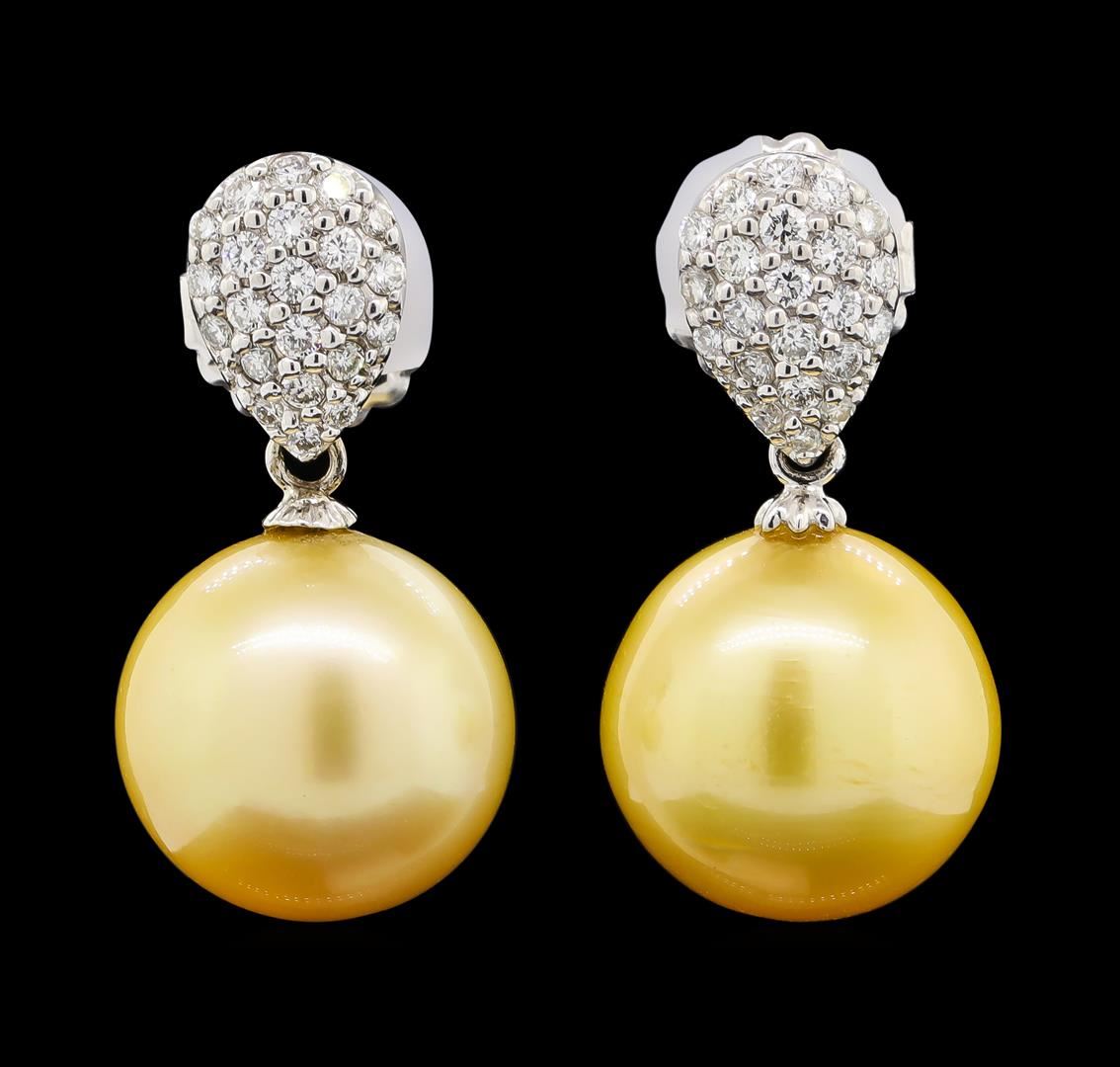 One pair electronically tested 14KT white gold lady's combination cast & assembled fashion dangle earrings with heavy friction backs with a bright polish finish. The featured lady's earrings have a drop of approximately 28 millimeters. Identified with markings of '14K'. Condition is new, good workmanship. Containing: Two south sea cultured pearls, 14.2mm to 14.1mm in size. The pearls are dark golden in color with a good luster, round to near round, and mostly clean with very good matching. Graded in the setting. Forty-Four prong set round brilliant cut diamonds, measuring 1.40 - 1.35 x 0.86mm (depth est.) approximate total weight of 44 Stones = 0.44ct. Graded in the setting. Clarity VS-2 to SI-1. Color: G - H Cut Good. Total Weight of Diamonds 0.44ct.. Total Weight of Earrings 11.90gm. GAS Appraised at $6,355.00.
