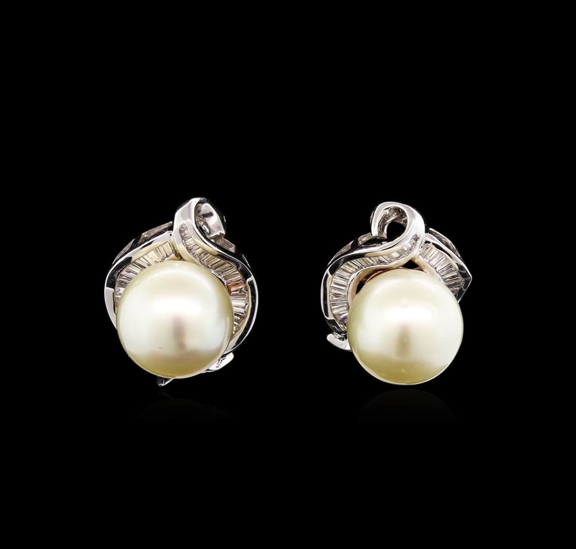 One pair of earrings featuring: 18KT white gold weighing 12.98 grams containing two pearls measuring approximately 11mm and diamonds with a total weight of 1.10ct.