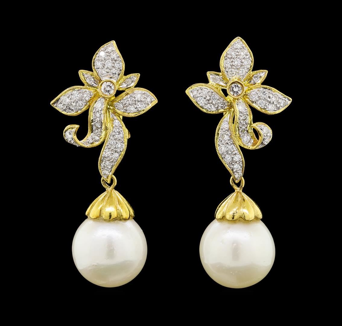 One pair electronically tested 18KT yellow gold lady's combination cast & assembled floral dangle earrings with Omega clip backs with posts with a bright polish with milgrain detailing finish. The featured lady's earrings have a drop of approximately 43 millimeters. Identified with markings of '18K'. Condition is new, good workmanship. Containing: Two south sea cultured pearls, 13.4mm to 13.2mm in size. The pearls are white in color with a good luster, round to near round, and moderately blemished with very good matching. Graded in the setting. Two bezel set round brilliant cut diamonds, measuring 2.20 - 2.15 x 1.35mm (depth est.) approximate total weight of 2 Stones = 0.08ct. Graded in the setting. Clarity SI-1 to SI-2. Color: G - H Cut Good Seventy-Two prong set round brilliant cut diamonds, measuring 1.40 - 1.30 x 0.84mm (depth est.) approximate total weight of 72 Stones = 0.67ct. Graded in the setting. Clarity VS-2 to SI-2. Color: G - H Cut Good. Total Weight of Diamonds 0.75ct.. Total Weight of Earrings 17.30gm. GAS Appraised at $6,430.00.