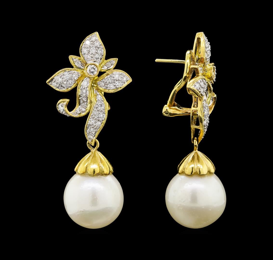 One pair electronically tested 18KT yellow gold lady's combination cast & assembled floral dangle earrings with Omega clip backs with posts with a bright polish with milgrain detailing finish. The featured lady's earrings have a drop of approximately 43 millimeters. Identified with markings of '18K'. Condition is new, good workmanship. Containing: Two south sea cultured pearls, 13.4mm to 13.2mm in size. The pearls are white in color with a good luster, round to near round, and moderately blemished with very good matching. Graded in the setting. Two bezel set round brilliant cut diamonds, measuring 2.20 - 2.15 x 1.35mm (depth est.) approximate total weight of 2 Stones = 0.08ct. Graded in the setting. Clarity SI-1 to SI-2. Color: G - H Cut Good Seventy-Two prong set round brilliant cut diamonds, measuring 1.40 - 1.30 x 0.84mm (depth est.) approximate total weight of 72 Stones = 0.67ct. Graded in the setting. Clarity VS-2 to SI-2. Color: G - H Cut Good. Total Weight of Diamonds 0.75ct.. Total Weight of Earrings 17.30gm. GAS Appraised at $6,430.00.