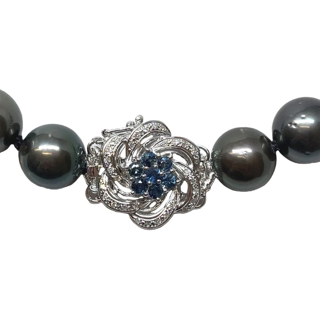 One graduated single strand pearl necklace 18.5" princess length, knotted with a tongue clasp & foldover safety containing 35 Tahitian pearls, 13.5mm to 11.0mm in size. The pearls are black in color, green overtone with a very good luster, round to near round, and lightly blemished with very good matching. The featured pearl necklace has a 14KT white gold round floral motif clasp encrusted with sapphires and diamonds and features 8 sapphire encrusted rondels. Graded on the strand.Tahitian cultured pearls form in the Pinctada Margaritifera oysters. This species is native to the central and South Pacific Ocean but is generally raised in lagoons by pearl farmers. Tahitian cultured pearls take between two to four years to form. Thirty prong set single cut diamonds, measuring 1.10 - 1.00 x 0.65mm (depth est.) approximate total weight of 30 Stones = 0.13ct. Graded in the setting. Color H - I Clarity SI-1 to I-1 Cut Good Seven prong set round modified brilliant cut natural blue sapphires, measuring 2.60 - 2.50 x 1.79 mm, (depth est.) approximate total weight of 0.70ct., clarity is eye clean, medium, moderately strong, very slightly greenish blue color, (GIA vslgB 5/4), cut is good. Transmitting light with no distortion, transparent. Colored gemstones are presumed to have been subjected to commonly used enhancement processes. Graded in the setting. Eighty prong set round modified brilliant cut natural blue sapphires, measuring 1.70 - 1.65 x 1.09 mm, (depth est.) approximate total weight of 2.40ct., clarity is slightly included, medium dark, moderately strong, blue color, (GIA B 6/4), cut is good. Transmitting light with a minimum of distortion, transparent. Colored gemstones are presumed to have been subjected to commonly used enhancement processes. Graded in the setting. Total Weight of Colored Stones 3.10ct. Total Weight of Diamonds 0.13ct. Total Weight of 91.20gm