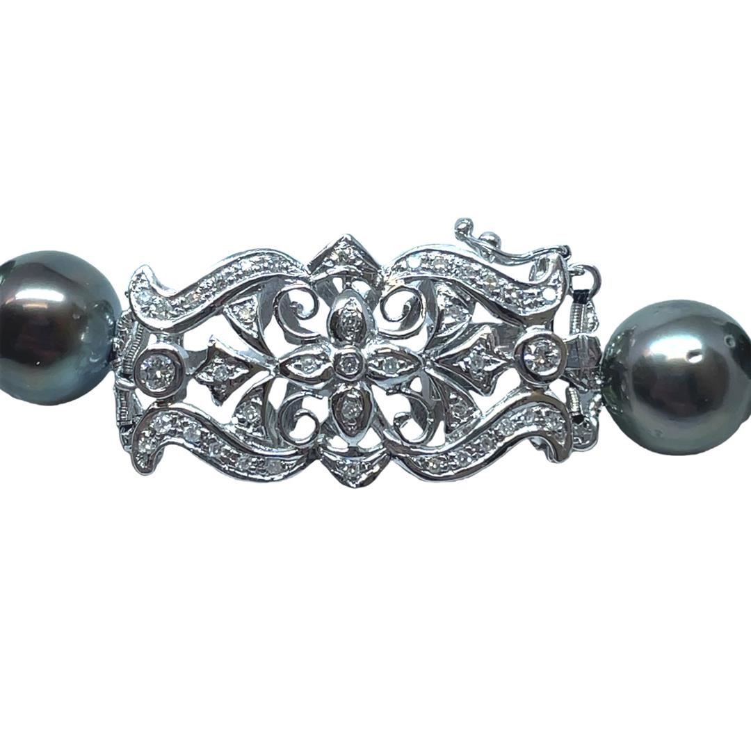 One graduated single strand pearl necklace 18.5" princess length, knotted with a tongue clasp & foldover safety containing 37 Tahitian pearls, 12.8mm to 10.0mm in size. The pearls are black in color, green overtone with a very good luster, round to near round, and mostly clean with very good matching. The featured pearl necklace has a 14KT white gold rectangular shaped with a floral motif clasp encrusted with diamonds. Graded on the strand.Tahitian cultured pearls form in the Pinctada Margaritifera oysters. This species is native to the central and South Pacific Ocean but is generally raised in lagoons by pearl farmers. Tahitian cultured pearls take between two to four years to form. Two bezel set round brilliant cut diamonds, measuring 2.40 - 2.35 x 1.48mm (depth est.) approximate total weight of 2 Stones = 0.10ct. Graded in the setting. Color H - I Clarity VS-2 to SI-1 Cut Very Good Thirty-Seven prong set single cut diamonds, measuring 1.30 - 1.20 x 0.78mm (depth est.) approximate total weight of 37 Stones = 0.28ct. Graded in the setting. Color G - I Clarity SI-1 to SI-3 Cut Good Total Weight of Diamonds 0.38ct. Total Weight of 77.70gm