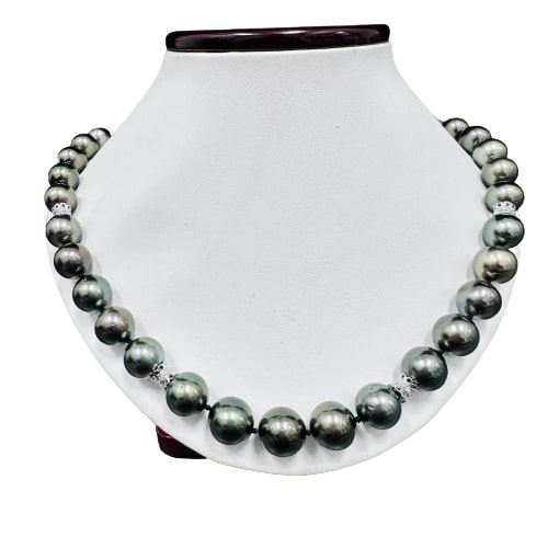 One graduated single strand pearl necklace 18.5" princess length, knotted with a tongue clasp & foldover safety containing 37 Tahitian pearls, 12.7mm to 10.0mm in size. The pearls are black in color, green overtone with a very good luster, round to near round, and lightly blemished with very good matching. The featured pearl necklace has a 14KT white gold bow motif clasp encrusted with diamonds and features 4 diamond encrusted rondels. Graded on the strand.Tahitian cultured pearls form in the Pinctada Margaritifera oysters. This species is native to the central and South Pacific Ocean but is generally raised in lagoons by pearl farmers. Tahitian cultured pearls take between two to four years to form. Seventy-Six prong set single cut diamonds, measuring 1.10 - 1.00 x 0.65mm (depth est.) approximate total weight of 76 Stones = 0.35ct. Graded in the setting. Color H - I Clarity SI-1 to I-1 Cut Good Total Weight of Diamonds 0.35ct. Total Weight of 83.10gm