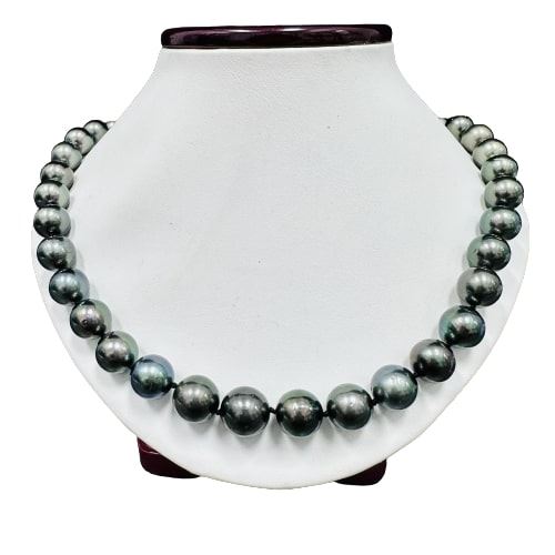 One graduated single strand pearl necklace 18.5" princess length, knotted with a tongue clasp & foldover safety containing 37 Tahitian pearls, 12.8mm to 10.0mm in size. The pearls are black in color, green overtone with a very good luster, round to near round, and mostly clean with very good matching. The featured pearl necklace has a 14KT white gold rectangular shaped with a floral motif clasp encrusted with diamonds. Graded on the strand.Tahitian cultured pearls form in the Pinctada Margaritifera oysters. This species is native to the central and South Pacific Ocean but is generally raised in lagoons by pearl farmers. Tahitian cultured pearls take between two to four years to form. Two bezel set round brilliant cut diamonds, measuring 2.40 - 2.35 x 1.48mm (depth est.) approximate total weight of 2 Stones = 0.10ct. Graded in the setting. Color H - I Clarity VS-2 to SI-1 Cut Very Good Thirty-Seven prong set single cut diamonds, measuring 1.30 - 1.20 x 0.78mm (depth est.) approximate total weight of 37 Stones = 0.28ct. Graded in the setting. Color G - I Clarity SI-1 to SI-3 Cut Good Total Weight of Diamonds 0.38ct. Total Weight of 77.70gm