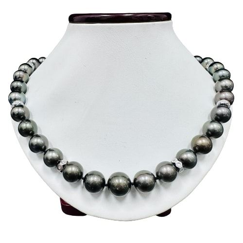 One graduated single strand pearl necklace 18.5" princess length, knotted with a tongue clasp & foldover safety containing 35 Tahitian pearls, 13.8mm to 11.1mm in size. The pearls are black in color, green overtone with a very good luster, round to near round, and lightly blemished with very good matching. The featured pearl necklace has a 14KT white gold bow motif clasp encrusted with diamonds and features 6 diamond encrusted rondels. Graded on the strand.Tahitian cultured pearls form in the Pinctada Margaritifera oysters. This species is native to the central and South Pacific Ocean but is generally raised in lagoons by pearl farmers. Tahitian cultured pearls take between two to four years to form. Forty-Six prong set single cut diamonds, measuring 1.10 - 1.00 x 0.65mm (depth est.) approximate total weight of 46 Stones = 0.20ct. Graded in the setting.Color H - IClarity SI-1 to I-1 Cut Good Thirty-Six bezel set single cut diamonds, measuring 1.20 - 1.10 x 0.71mm (depth est.) approximate total weight of 36 Stones = 0.20ct. Graded in the setting.Color H - IClarity SI-1 to I-1 Cut Good Total Weight of Diamonds 0.40ct. Total Weight of 95.30gm