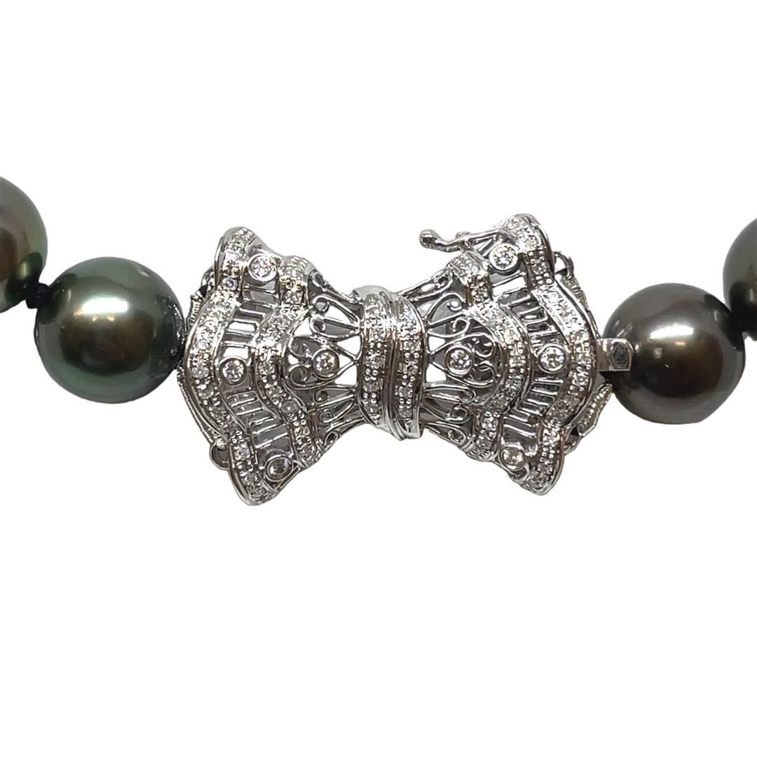 One graduated single strand pearl necklace 18.5" princess length, knotted with a tongue clasp & foldover safety containing 35 Tahitian pearls, 14.0mm to 11.0mm in size. The pearls are black in color, green overtone with a very good luster, round to near round, and lightly blemished with very good matching. The featured pearl necklace has a 14KT white gold bow shaped clasp encrusted with diamonds. Graded on the strand.Tahitian cultured pearls form in the Pinctada Margaritifera oysters. This species is native to the central and South Pacific Ocean but is generally raised in lagoons by pearl farmers. Tahitian cultured pearls take between two to four years to form. Eight prong set round brilliant cut diamonds, measuring 1.60 - 1.55 x 0.98mm (depth est.) approximate total weight of 8 Stones = 0.12ct. Graded in the setting. Color H - I Clarity SI-1 to SI-2 Cut Good Fifty-Eight prong set single cut diamonds, measuring 1.10 - 1.00 x 0.65mm (depth est.) approximate total weight of 58 Stones = 0.25ct. Graded in the setting. Color H - I Clarity SI-1 to I-1 Cut Good Total Weight of Diamonds 0.37ct. Total Weight of 94.50gm