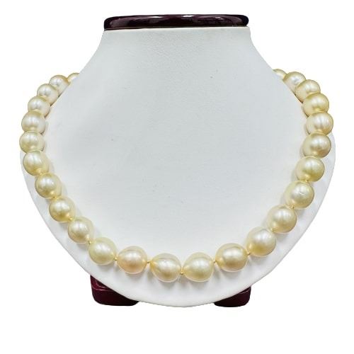 One graduated single strand pearl necklace 18.5" princess length, knotted with a tongue clasp & foldover safety containing 31 south sea cultured pearls, 14.6mm to 11.0mm in size. The pearls are golden in color, green overtone with a very good luster, near round to off round, and mostly clean with very good matching. The featured pearl necklace has a 14KT yellow gold bow motif clasp encrusted with diamonds. Graded on the strand.South Sea cultured pearls are farmed in the oceans surrounding Australia, Indonesia, the Philippines and the southern coast of China. The main source of Australian South Sea pearls lies in the northwest on the Kimberly coast. South Sea cultured pearls are formed in the Pinctada Maxima oyster, which is the world's largest pearl cultivating oyster and is native to the South China Sea, the Java, the Indian and the Pacific Oceans. There are two varieties of the Pinctada Maxima oyster: the Gold Lipped oyster which produces golden colored pearls, and the Silver Lipped oyster which produces white colored pearls. These pearls take between two to three years to grow and have a unique nacre due to the fast moving and clean waters of the South Seas. Sixty-Eight prong set single cut diamonds, measuring 1.10 - 1.00 x 0.65mm (depth est.) approximate total weight of 68 Stones = 0.30ct. Graded in the setting. Color H - I Clarity SI-1 to I-1 Cut Good Total Weight of Diamonds 0.30ct. Total Weight of 93.40gm