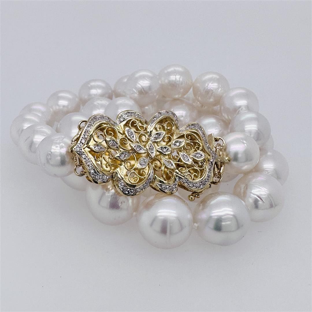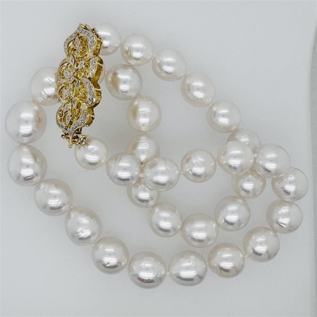 One graduated single strand pearl necklace 18.5" princess length, knotted with a tongue clasp & foldover safety containing 33 south sea cultured pearls, 14.6mm to 11.0mm in size. The pearls are white in color, green overtone with a very good luster, near round, and moderately blemished with very good matching. The featured pearl necklace has a 14KT yellow gold floral motif clasp encrusted with diamonds. Graded on the strand. South Sea cultured pearls are farmed in the oceans surrounding Australia, Indonesia, the Philippines and the southern coast of China. The main source of Australian South Sea pearls lies in the northwest on the Kimberly coast. South Sea cultured pearls are formed in the Pinctada Maxima oyster, which is the world's largest pearl cultivating oyster and is native to the South China Sea, the Java, the Indian and the Pacific Oceans. There are two varieties of the Pinctada Maxima oyster: the Gold Lipped oyster which produces golden colored pearls, and the Silver Lipped oyster which produces white colored pearls. These pearls take between two to three years to grow and have a unique nacre due to the fast moving and clean waters of the South Seas. Thirteen bezel set single cut diamonds, measuring 1.10 -1.00 x 0.65mm (depth est.) approximate total weight of 13 Stones = 0.06ct. Color of H - I, clarity of SI-1 to 1-1, cut is good. Graded in the setting. Forty prong set single cut diamonds, measuring 1.10 1.00 x 0.65mm (depth est.) approximate total weight of 40 Stones = 0.20ct. Color of H-1, clarity of SI-1 to I-1, cut is good. Graded in the setting. Total Weight of Diamonds Total Weight of Total Estimated Retail Value 0.26ct. 99.60gm $ 23170.00