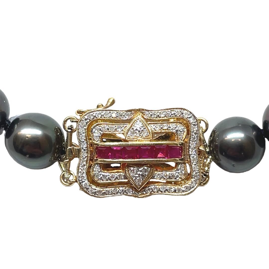 One graduated single strand pearl necklace 18.5" princess length, knotted with a tongue clasp & foldover safety containing 37 Tahitian pearls, 12.6mm to 10.0mm in size. The pearls are black in color, green overtone with a very good luster, round to near round, and mostly clean with very good matching. The featured pearl necklace has a 14KT yellow gold rectangle shaped with a Art Deco motif clasp encrusted with diamonds and rubies. Graded on the strand.Tahitian cultured pearls form in the Pinctada Margaritifera oysters. This species is native to the central and South Pacific Ocean but is generally raised in lagoons by pearl farmers. Tahitian cultured pearls take between two to four years to form. Six channel set square step cut natural rubies, measuring 2.50 x 2.40 x 1.59mm, (depth est.) approximate total weight of 0.60ct., clarity is eye clean, medium, moderately strong, slightly purplish red color, (GIA slpR 5/4), cut is very good. Colored gemstones are presumed to have been subjected to commonly used enhancement processes. Transmitting light with a minimum of distortion, transparent. Graded in the setting. Sixty-Eight prong set single cut diamonds, measuring 1.20 - 1.10 x 0.71mm (depth est.) approximate total weight of 68 Stones = 0.38ct. Graded in the setting. Color H - I Clarity SI-1 to I-1 Cut Good Forty-eight channel set round modified brilliant cut natural rubies, measuring 2.10 - 2.00 x 1.33 mm, (depth est.) approximate total weight of 2.40ct., clarity is slightly included, medium, strong, red color, (GIA R 5/5), cut is very good. Colored gemstones are presumed to have been subjected to commonly used enhancement processes. Transmitting light with a minimum of distortion, transparent. Graded in the setting. Total Weight of Colored Stones 3.00ct. Total Weight of Diamonds 0.38ct. Total Weight of 78.20gm