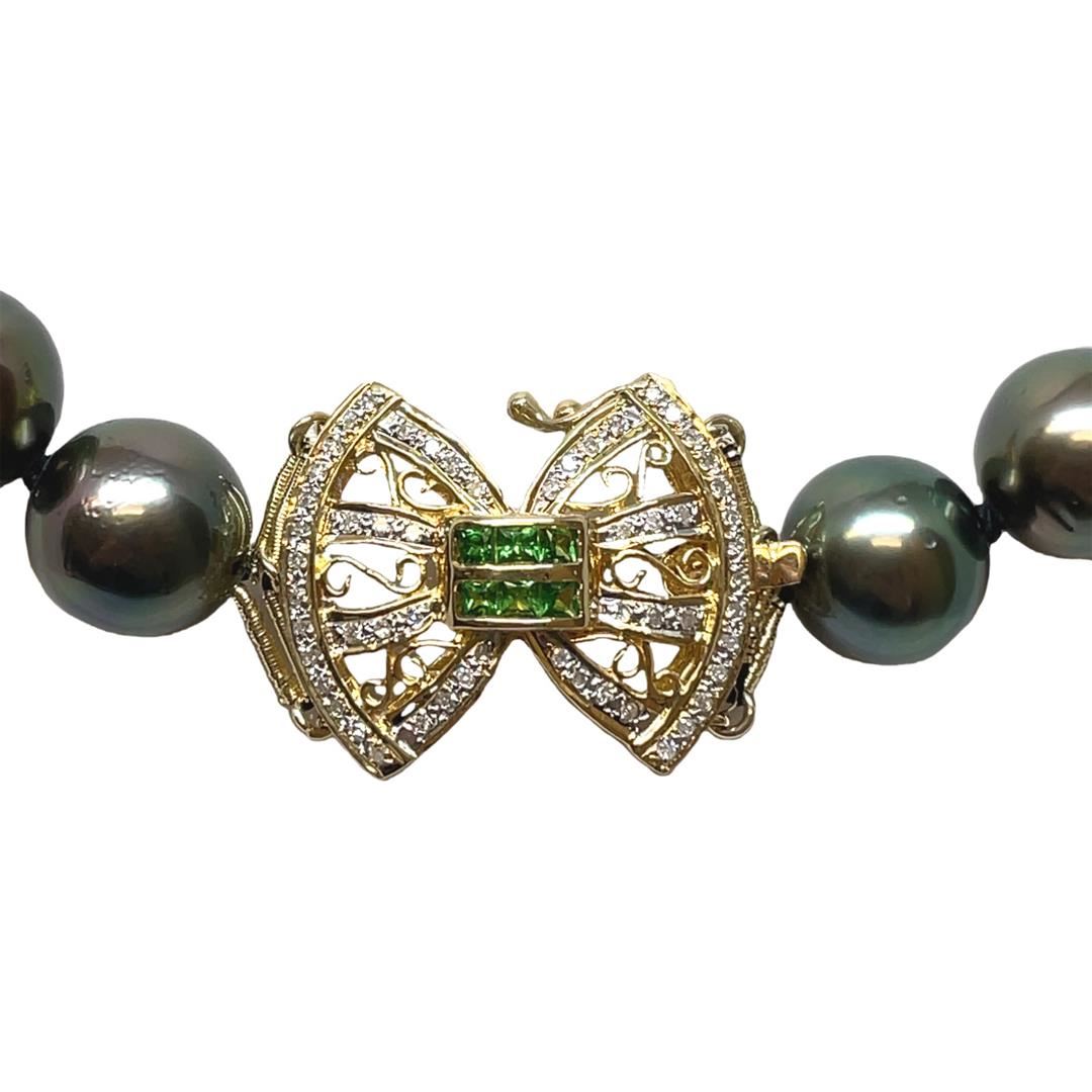 One graduated single strand pearl necklace 18.5" princess length, knotted with a tongue clasp & foldover safety containing 35 Tahitian pearls, 14.0mm to 11.1mm in size. The pearls are peacock in color, rosé overtone with a very good luster, round to near round, and lightly blemished with very good matching. The featured pearl necklace has a 14KT yellow gold bow shaped clasp encrusted with diamonds and emeralds. Graded on the strand.Tahitian cultured pearls form in the Pinctada Margaritifera oysters. This species is native to the central and South Pacific Ocean but is generally raised in lagoons by pearl farmers. Tahitian cultured pearls take between two to four years to form. Six channel set princess modified brilliant cut natural emeralds, measuring 2.00 x 1.80 x 1.35mm, (depth est.) approximate total weight of 0.25ct., clarity is eye clean, medium, strong, green color, (GIA G 5/5), cut is very good. Transmitting light with a minimum of distortion, transparent. Colored gemstones are presumed to have been subjected to commonly used enhancement processes. Indications of oil residue. Graded in the setting. Fifty-Six prong set single cut diamonds, measuring 1.10 - 1.00 x 0.65mm (depth est.) approximate total weight of 56 Stones = 0.25ct. Graded in the setting. Color H - I Clarity SI-2 to I-1 Cut Very Good Total Weight of Colored Stones 0.25ct. Total Weight of Diamonds 0.25ct. Total Weight of 92.10gm