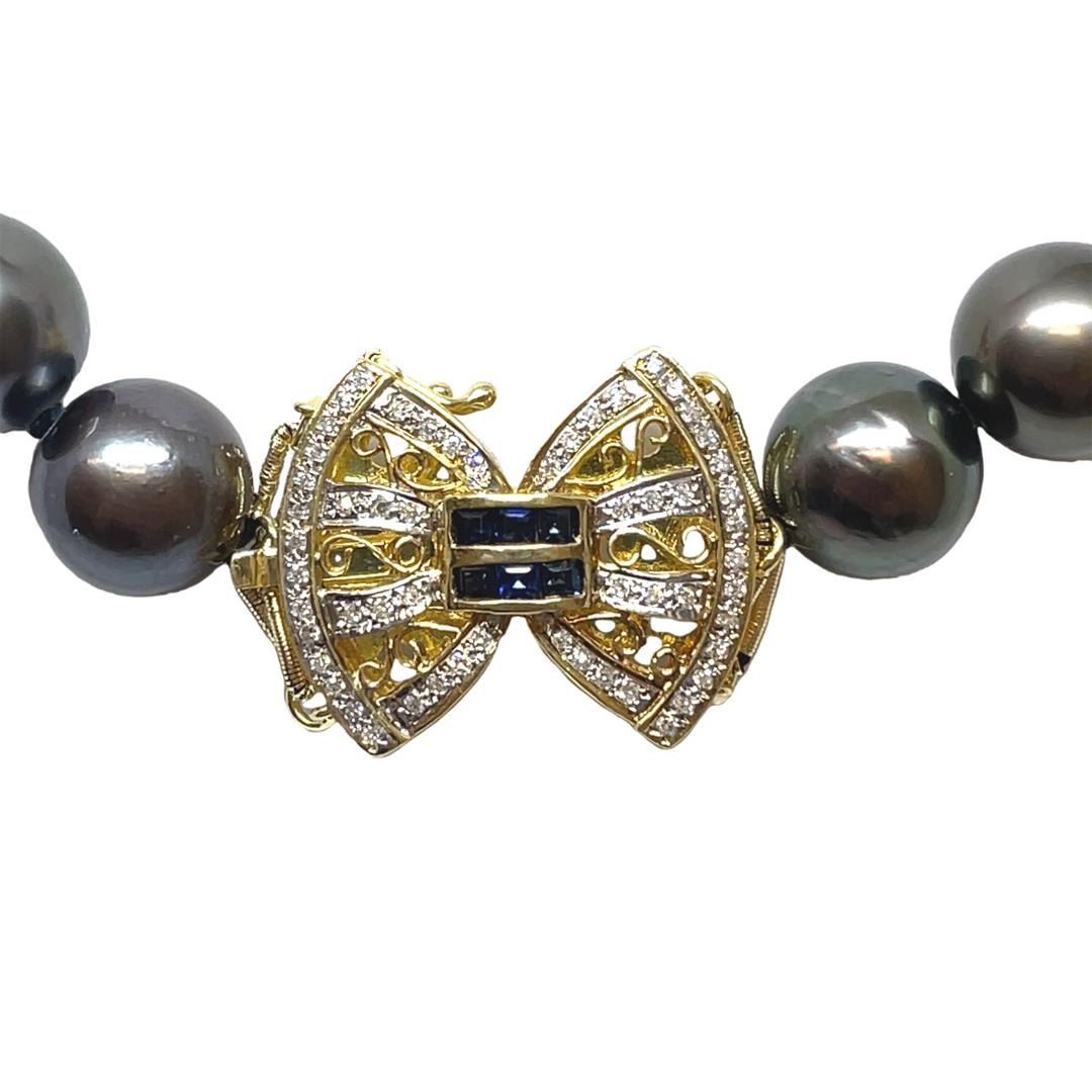 One graduated single strand pearl necklace 18.5" princess length, knotted with a tongue clasp & foldover safety containing 35 Tahitian pearls, 13.9mm to 11.1mm in size. The pearls are black in color, green overtone with a very good luster, round to near round, and mostly clean with very good matching. The featured pearl necklace has a 14KT yellow gold bow shaped with a Art Deco motif clasp encrusted with diamonds and sapphires. Graded on the strand.Tahitian cultured pearls form in the Pinctada Margaritifera oysters. This species is native to the central and South Pacific Ocean but is generally raised in lagoons by pearl farmers. Tahitian cultured pearls take between two to four years to form. Six channel set square step cut natural blue sapphires, measuring 2.20 x 2.00 x 1.37mm, (depth est.) approximate total weight of 0.36ct., clarity is eye clean, medium, strong, blue color, (GIA B 5/5), cut is good. Colored gemstones are presumed to have been subjected to commonly used enhancement processes. Transmitting light with a minimum of distortion, transparent. Graded in the setting.Forty-eight channel set round modified brilliant cut natural blue sapphires, measuring 2.10 - 2.00 x 1.33 mm, (depth est.) approximate total weight of 2.40ct., clarity is slightly included, dark, moderately strong, blue color, (GIA B 7/4), cut is good. Colored gemstones are presumed to have been subjected to commonly used enhancement processes. Transmitting light somewhat diffusely, transparent to translucent. Graded in the setting.Fifty-Six prong set single cut diamonds, measuring 1.10 - 1.00 x 0.63mm (depth est.) approximate total weight of 56 Stones = 0.24ct. Graded in the setting.Color H - IClarity SI-1 to I-1 Cut Good Total Weight of Colored Stones 2.76ct. Total Weight of Diamonds 0.24ct. Total Weight of 99.00gm
