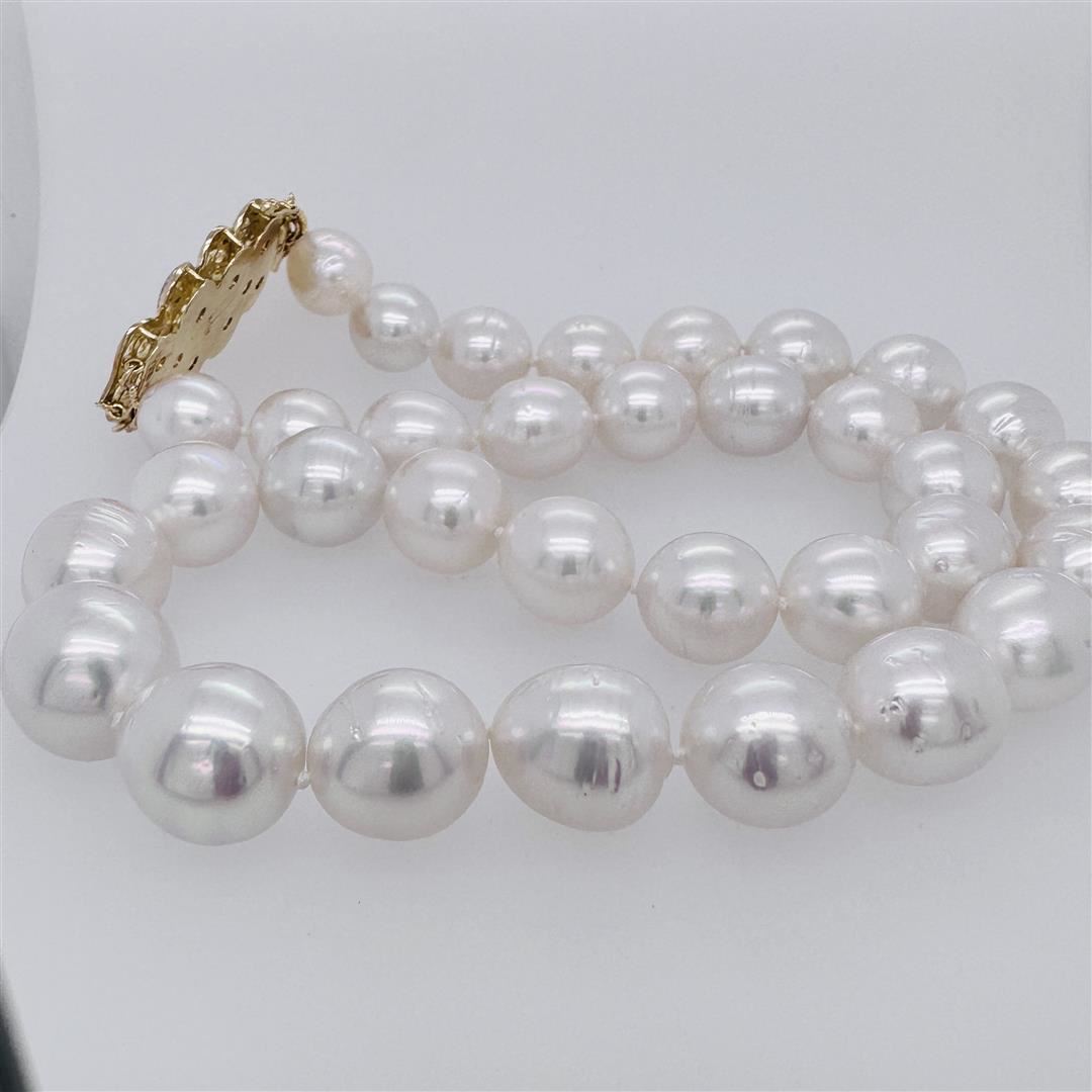 One graduated single strand pearl necklace 18.5" princess length, knotted with a tongue clasp & foldover safety containing 33 south sea cultured pearls, 14.6mm to 11.0mm in size. The pearls are white in color, green overtone with a very good luster, near round, and moderately blemished with very good matching. The featured pearl necklace has a 14KT yellow gold floral motif clasp encrusted with diamonds. Graded on the strand. South Sea cultured pearls are farmed in the oceans surrounding Australia, Indonesia, the Philippines and the southern coast of China. The main source of Australian South Sea pearls lies in the northwest on the Kimberly coast. South Sea cultured pearls are formed in the Pinctada Maxima oyster, which is the world's largest pearl cultivating oyster and is native to the South China Sea, the Java, the Indian and the Pacific Oceans. There are two varieties of the Pinctada Maxima oyster: the Gold Lipped oyster which produces golden colored pearls, and the Silver Lipped oyster which produces white colored pearls. These pearls take between two to three years to grow and have a unique nacre due to the fast moving and clean waters of the South Seas. Thirteen bezel set single cut diamonds, measuring 1.10 -1.00 x 0.65mm (depth est.) approximate total weight of 13 Stones = 0.06ct. Color of H - I, clarity of SI-1 to 1-1, cut is good. Graded in the setting. Forty prong set single cut diamonds, measuring 1.10 1.00 x 0.65mm (depth est.) approximate total weight of 40 Stones = 0.20ct. Color of H-1, clarity of SI-1 to I-1, cut is good. Graded in the setting. Total Weight of Diamonds Total Weight of Total Estimated Retail Value 0.26ct. 99.60gm $ 23170.00