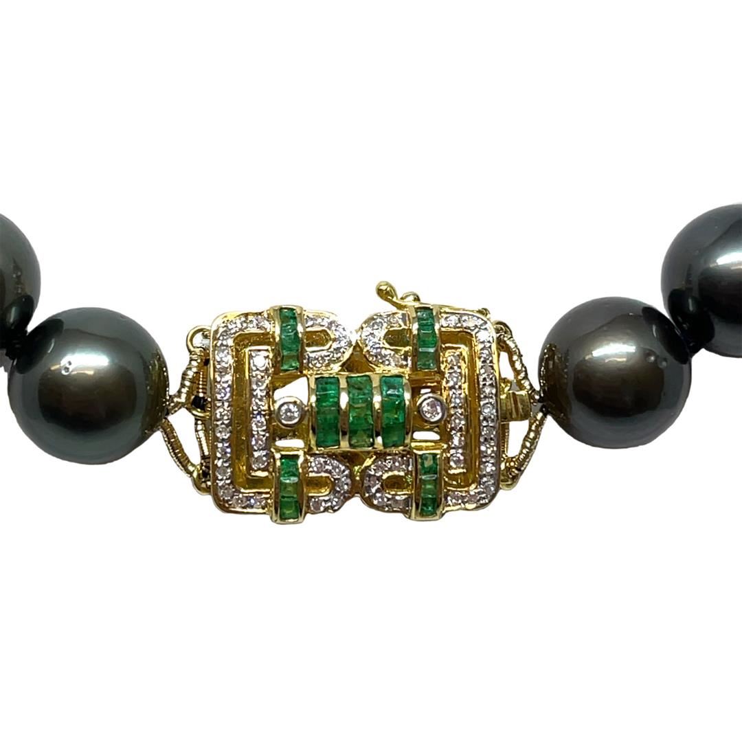 One graduated single strand pearl necklace 18.5" princess length, knotted with a tongue clasp & foldover safety containing 35 Tahitian pearls, 13.8mm to 11.0mm in size. The pearls are black in color, green overtone with a good luster, round to near round, and clean with very good matching. The featured pearl necklace has a 14KT yellow gold rectangular/Byzantine motif clasp with emeralds and diamonds. Graded on the strand.Tahitian cultured pearls form in the Pinctada Margaritifera oysters. This species is native to the central and South Pacific Ocean but is generally raised in lagoons by pearl farmers. Tahitian cultured pearls take between two to four years to form. Twenty-one channel set square step cut natural emeralds, measuring 2.00 x 1.35 x 1.09mm, (depth est.) approximate total weight of 0.45ct., clarity is slightly included, medium, moderately strong, green color, (GIA G 5/4), cut is good. Colored gemstones are presumed to have been subjected to commonly used enhancement processes. Indications of oil residue. Transmitting light with a minimum of distortion, transparent. Graded in the setting. Sixty prong set single cut diamonds, measuring 1.30 - 1.20 x 0.78mm (depth est.) approximate total weight of 60 Stones = 0.45ct. Graded in the setting. Color G - I Clarity SI-1 to SI-3 Cut Good Total Weight of Colored Stones 0.45ct. Total Weight of Diamonds 0.45ct. Total Weight of 90.20gm