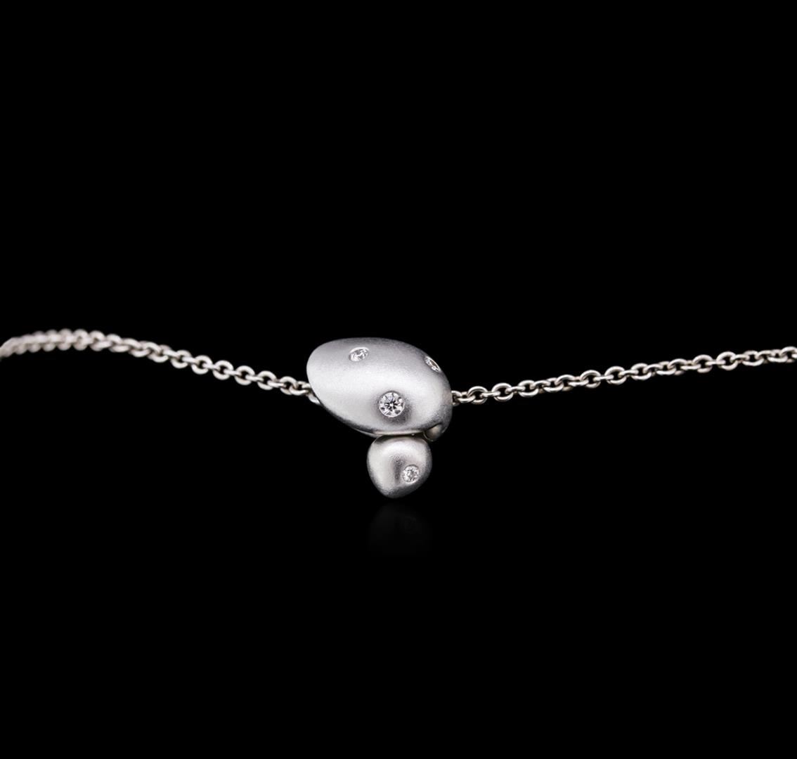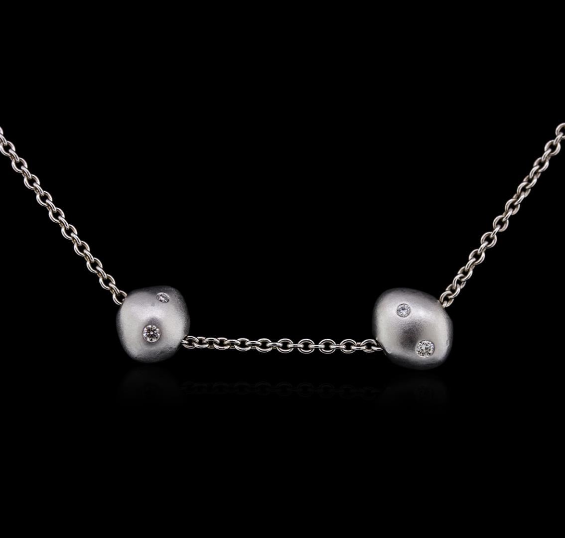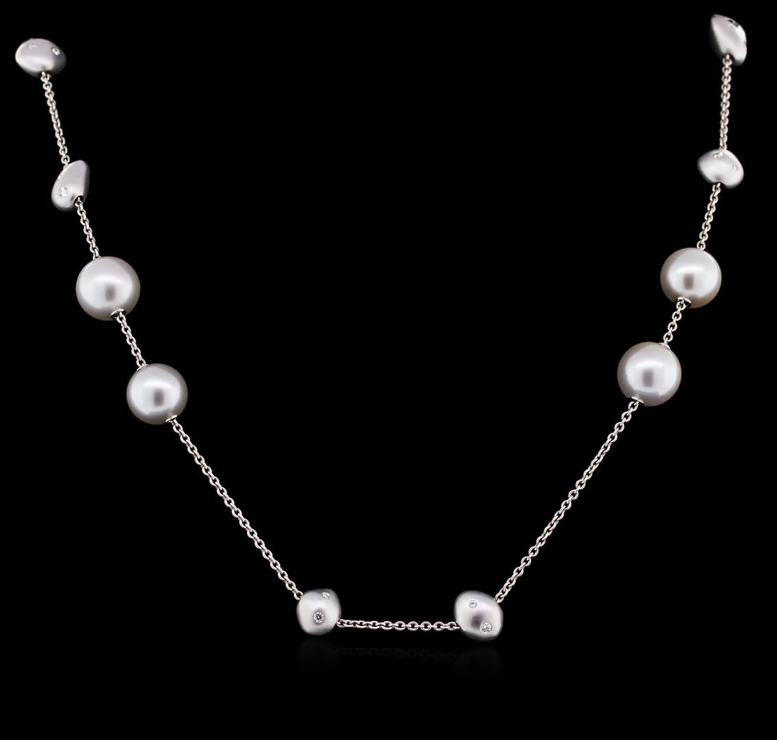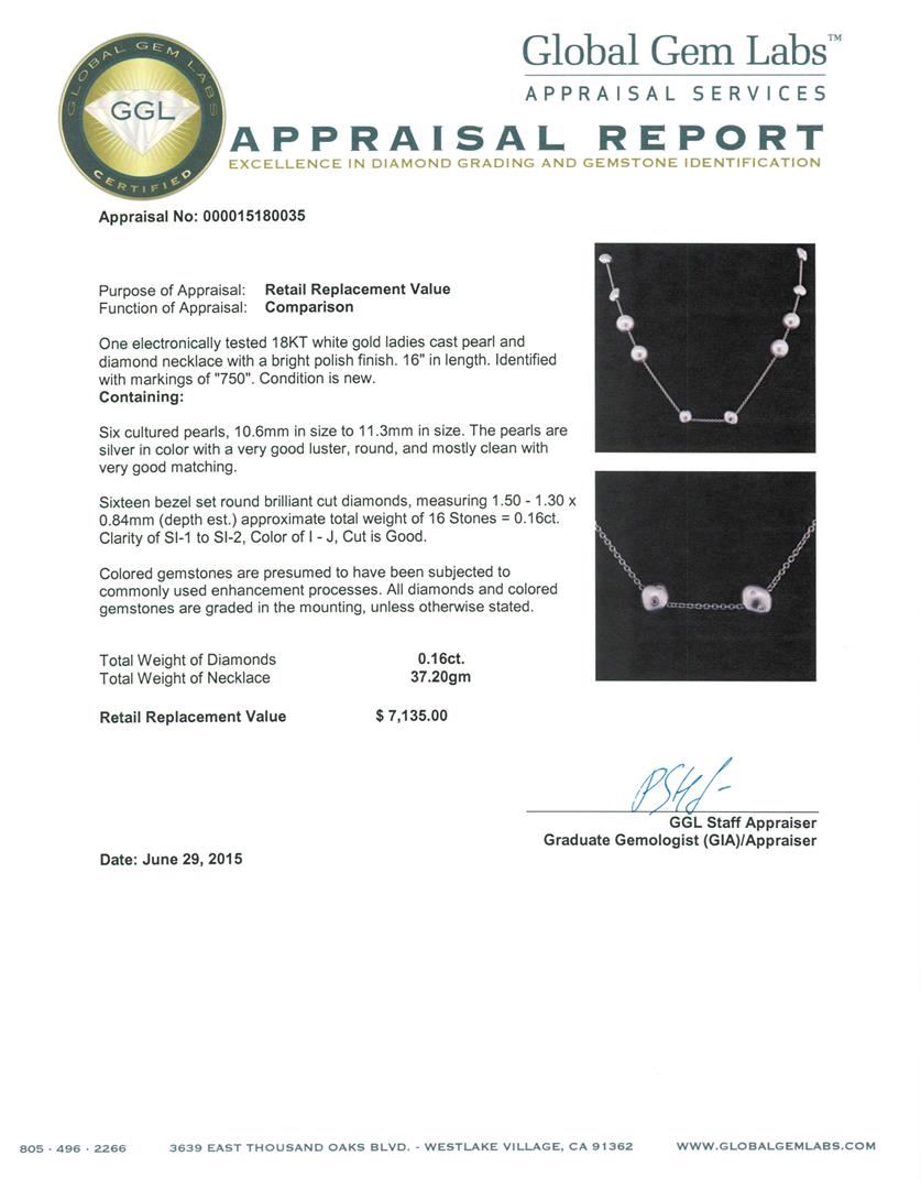 One electronically tested 18KT white gold ladies cast pearl and diamond necklace with a bright polish finish. 16" in length. Identified with markings of "750". Condition is new. Containing: Six cultured pearls, 10.6mm in size to 11.3mm in size. The pearls are silver in color with a very good luster, round, and mostly clean with very good matching. Sixteen bezel set round brilliant cut diamonds, measuring 1.50 - 1.30 x 0.84mm (depth est.) approximate total weight of 16 Stones = 0.16ct. Clarity: SI-1 to SI-2. Color: I - J, Cut is Good. Colored gemstones are presumed to have been subjected to commonly used enhancement processes. All diamonds and colored gemstones are graded in the mounting, unless otherwise stated. Total Weight of Diamonds 0.16ct. Total Weight of Necklace 37.20 grams. GGL Appraised at $7,135.00.