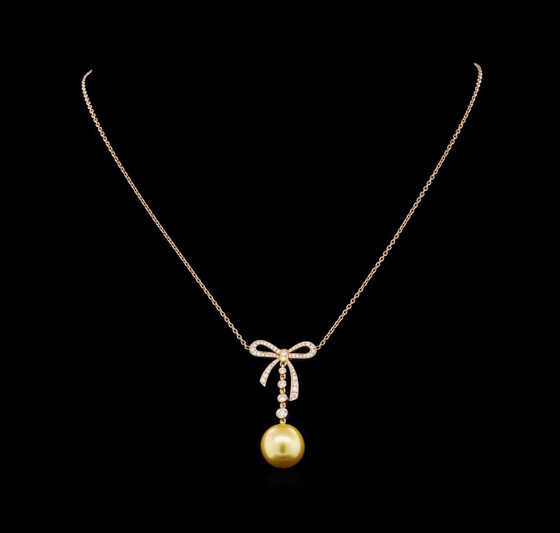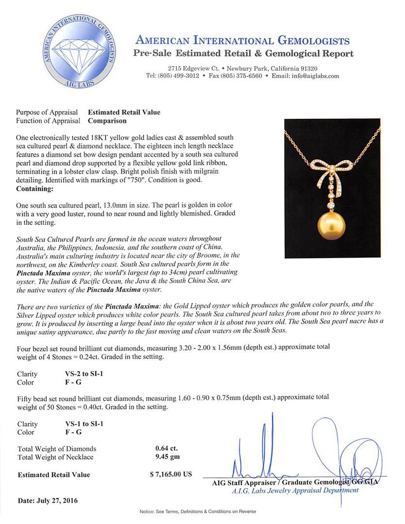 One south sea cultured pearl, 13.0mm in size. The pearl is golden in color with a very good luster, round to near round, lightly blemished Graded in the setting. South Sea Cultured Pearls are farmed in the ocean waters throughout Australia, the Philippines, Indonesia, and the southern coast of China. Australia's main culturing industry is located near the city of Broome, in the northwest, on the Kimberley coast. South Sea cultured pearls form in the Pinctada Maxima oyster, the world's largest (up to 34cm) pearl cultivating oyster. The Indian & Pacific Ocean, the Java & the South China Sea, are the native waters of the Pinctada Maxima oyster. There are two varieties of the Pinctada Maxima: the Gold Lipped oyster which produces the golden color pearls, and the Silver Lipped oyster which produces white color pearls. The South Sea cultured pearl takes from about two to three years to grow. It is produced by inserting a large bead into the oyster when it is about two years old. The South Sea pearl nacre has a unique satiny appearance, due partly to the fast moving and clean waters on the South Seas. Four bezel set round brilliant cut diamonds, measuring 3.20 - 2.00 x 1.56mm (depth est.) approximate total weight of 4 Stones = 0.24ct. Graded in the setting. Clarity VS-2 to SI-1. Color: F - G Fifty bead set round brilliant cut diamonds, measuring 1.60 - 0.90 x 0.75mm (depth est.) approximate total weight of 50 Stones = 0.40ct. Graded in the setting. Clarity VS-1 to SI-1. Color: F - G. Total Weight of Diamonds 0.64ct.. Total Weight of Necklace 9.45gm. AIG Appraised at $7,165.00.