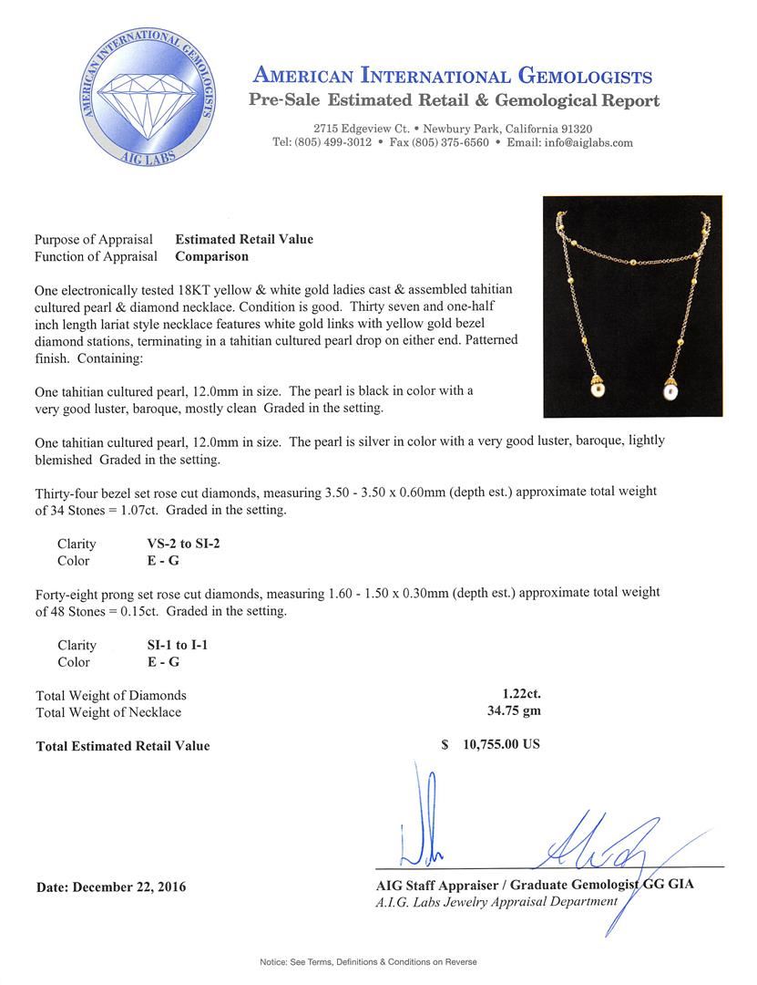 One electronically tested 18KT yellow & white gold ladies cast & assembled tahitian cultured pearl & diamond necklace. Thirty seven and one-half inch length lariat style necklace features white gold links with yellow gold bezel diamond stations, terminating in a tahitian cultured pearl drop on either end. Patterned finish. Condition is good. Containing: One tahitian cultured pearl, 12.0mm in size. The pearl is black in color with a very good luster, baroque, mostly clean Graded in the setting. One tahitian cultured pearl, 12.0mm in size. The pearl is silver in color with a very good luster, baroque, lightly blemished Graded in the setting. Thirty-Four bezel set rose cut diamonds, measuring 3.50 - 3.50 x 0.60mm (depth est.) approximate total weight of 34 Stones = 1.07ct. Graded in the setting. Clarity VS-2 to SI-2. Color: E - G Forty-Eight prong set rose cut diamonds, measuring 1.60 - 1.50 x 0.30mm (depth est.) approximate total weight of 48 Stones = 0.15ct. Graded in the setting. Clarity SI-1 to I-1. Color: E - G. Total Weight of Diamonds 1.22ct.. Total Weight of Necklace 34.75gm. AIG Appraised at $10,755.00.
