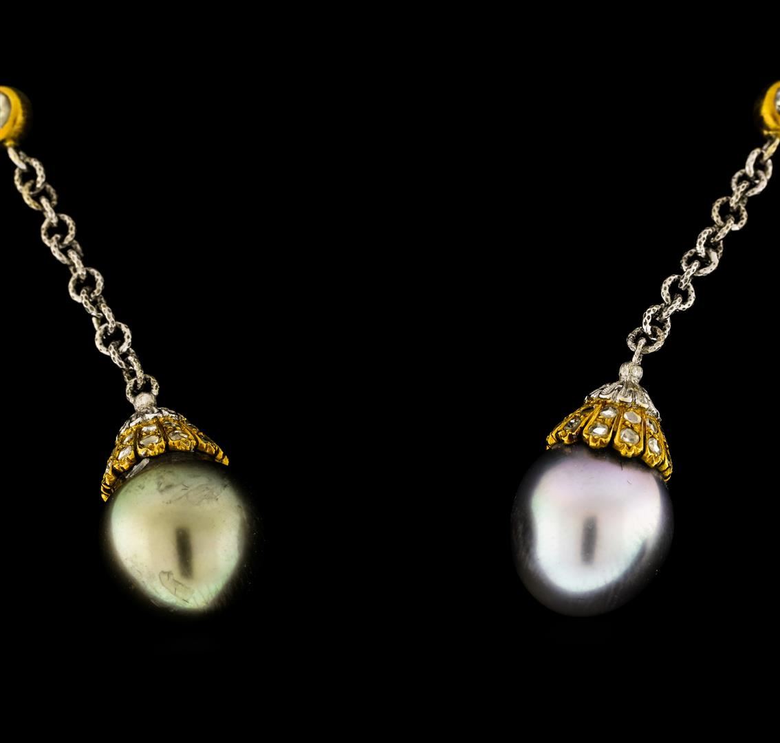 One electronically tested 18KT yellow & white gold ladies cast & assembled tahitian cultured pearl & diamond necklace. Thirty seven and one-half inch length lariat style necklace features white gold links with yellow gold bezel diamond stations, terminating in a tahitian cultured pearl drop on either end. Patterned finish. Condition is good. Containing: One tahitian cultured pearl, 12.0mm in size. The pearl is black in color with a very good luster, baroque, mostly clean Graded in the setting. One tahitian cultured pearl, 12.0mm in size. The pearl is silver in color with a very good luster, baroque, lightly blemished Graded in the setting. Thirty-Four bezel set rose cut diamonds, measuring 3.50 - 3.50 x 0.60mm (depth est.) approximate total weight of 34 Stones = 1.07ct. Graded in the setting. Clarity VS-2 to SI-2. Color: E - G Forty-Eight prong set rose cut diamonds, measuring 1.60 - 1.50 x 0.30mm (depth est.) approximate total weight of 48 Stones = 0.15ct. Graded in the setting. Clarity SI-1 to I-1. Color: E - G. Total Weight of Diamonds 1.22ct.. Total Weight of Necklace 34.75gm. AIG Appraised at $10,755.00.