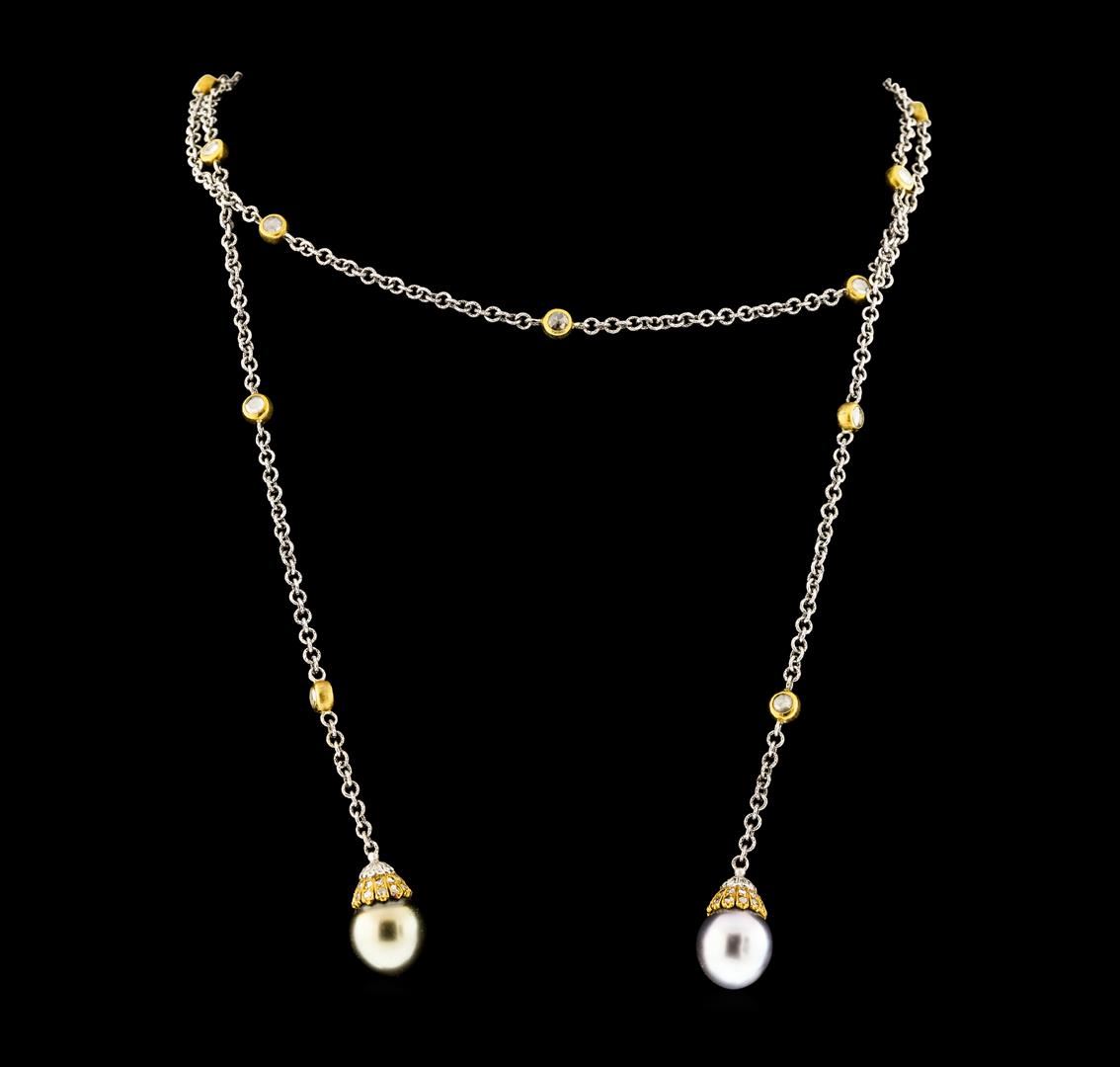 One electronically tested 18KT yellow & white gold ladies cast & assembled tahitian cultured pearl & diamond necklace. Thirty seven and one-half inch length lariat style necklace features white gold links with yellow gold bezel diamond stations, terminating in a tahitian cultured pearl drop on either end. Patterned finish. Condition is good. Containing: One tahitian cultured pearl, 12.0mm in size. The pearl is black in color with a very good luster, baroque, mostly clean Graded in the setting. One tahitian cultured pearl, 12.0mm in size. The pearl is silver in color with a very good luster, baroque, lightly blemished Graded in the setting. Thirty-Four bezel set rose cut diamonds, measuring 3.50 - 3.50 x 0.60mm (depth est.) approximate total weight of 34 Stones = 1.07ct. Graded in the setting. Clarity VS-2 to SI-2. Color: E - G Forty-Eight prong set rose cut diamonds, measuring 1.60 - 1.50 x 0.30mm (depth est.) approximate total weight of 48 Stones = 0.15ct. Graded in the setting. Clarity SI-1 to I-1. Color: E - G. Total Weight of Diamonds 1.22ct.. Total Weight of Necklace 34.75gm. AIG Appraised at $10,755.00.