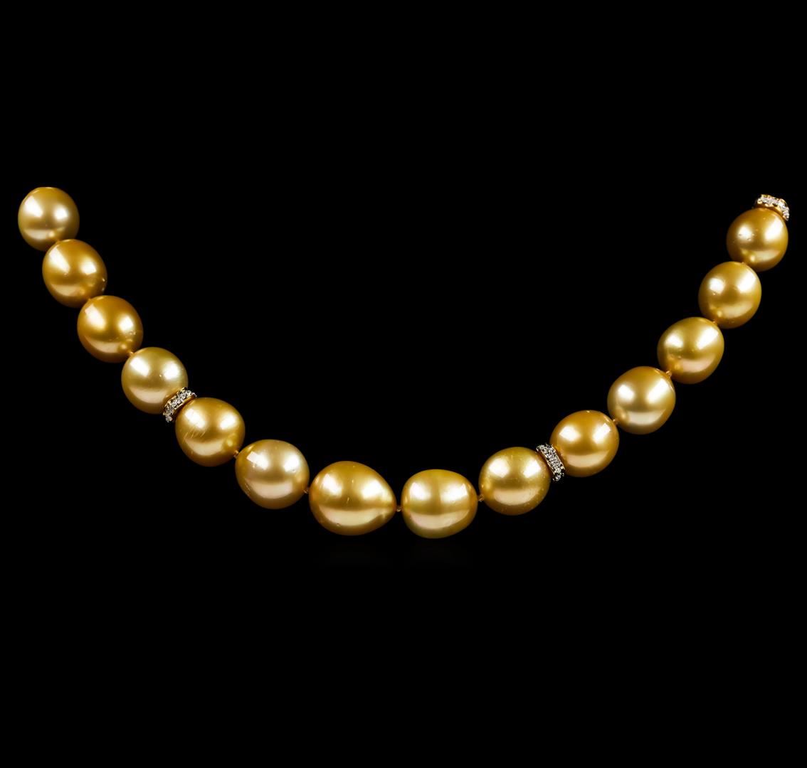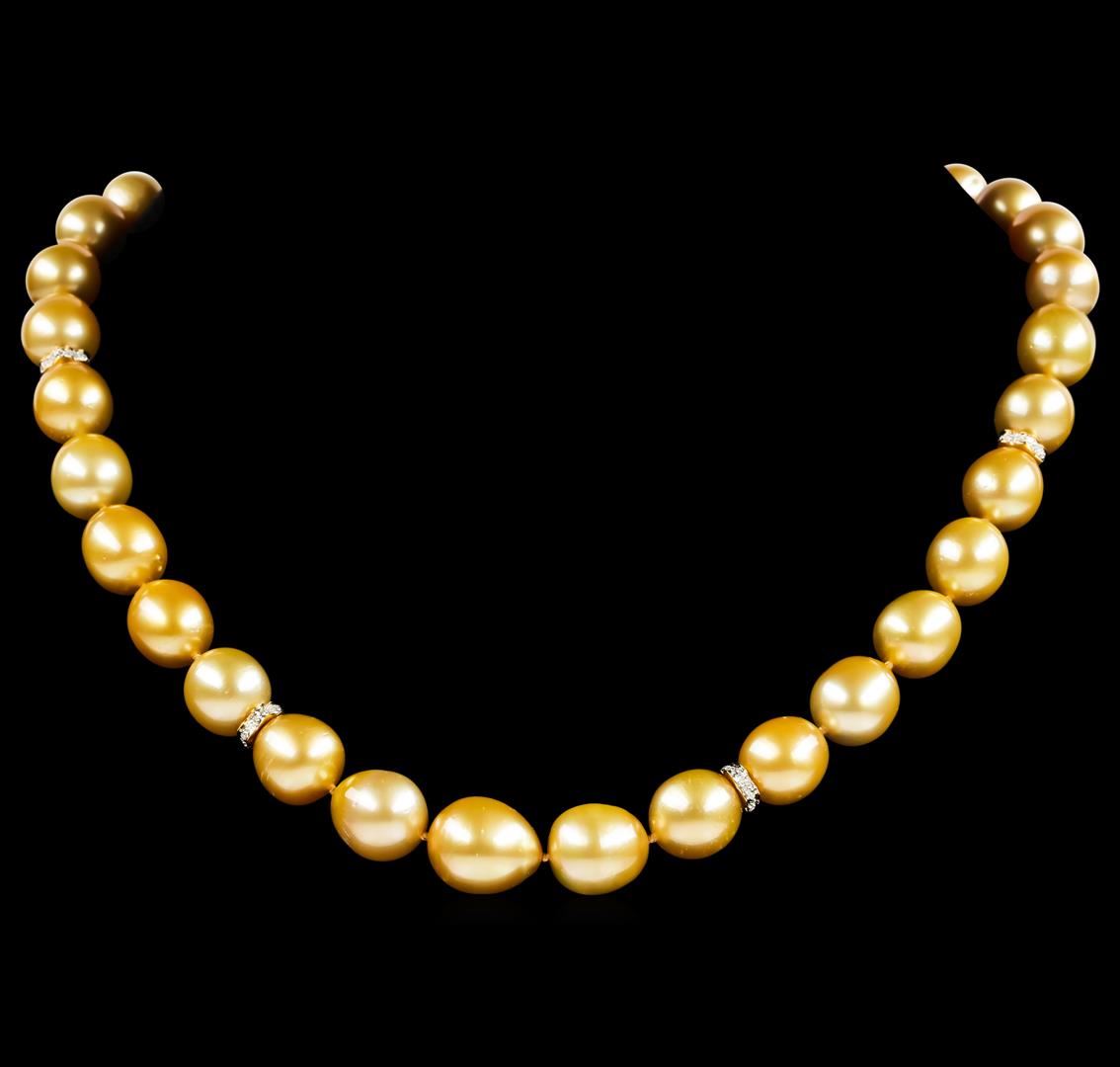 One graduated single strand pearl necklace 18.5' princess length, knotted with a tongue clasp containing 33 south sea cultured pearls, 13.5mm to 10.2mm in size. The pearls are dark golden in color with a good luster, off round, and mostly clean with good matching. The featured pearl necklace has 14KT yellow gold clasp and rondels. Graded on the strand.South Sea cultured pearls are farmed in the oceans surrounding Australia, Indonesia, the Philippines and the southern coast of China. The main source of Australian South Sea pearls lies in the northwest on the Kimberly coast. South Sea cultured pearls are formed in the Pinctada Maxima oyster. These pearls take between two to three years to grow and have a unique nacre due to the fast moving and clean waters of the South Seas. Fifty-Two prong set single cut diamonds, measuring 1.10 - 1.00 x 0.65mm (depth est.) approximate total weight of 52 Stones = 0.23ct. Graded in the setting. Color G - H Clarity VS-2 to SI-1 Cut Good. Total Weight of Diamonds 0.23ct.. Total Weight of 83.80gm GAS Appraised at $15,970.00.