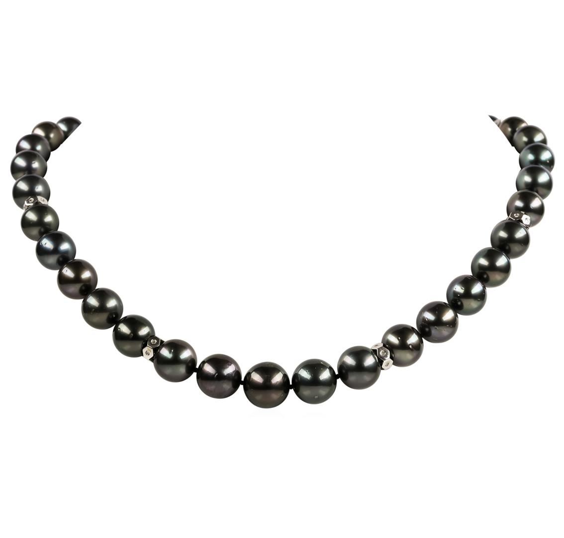 One graduated single strand pearl necklace 19.0' princess length, knotted with a tongue clasp & foldover safety containing 35 Tahitian pearls, 14.2mm to 11.0mm in size. The pearls are black in color, green overtone with a very good luster, round, and lightly blemished. The featured pearl necklace has 14KT white gold clasp and rondels. Graded on the strand.Tahitian cultured pearls form in the Pinctada Margaritifera oysters. This species is native to the central and South Pacific Ocean but is generally raised in lagoons by pearl farmers. Tahitian cultured pearls take between two to four years to form. Two bezel set round brilliant cut diamonds, measuring 2.60 - 2.50 x 1.58mm (depth est.) approximate total weight of 2 Stones = 0.13ct. Graded in the setting. Color G - H Clarity VS-2 to SI-1 Cut Good Thirty-Seven prong set single cut diamonds, measuring 1.10 - 1.00 x 0.65mm (depth est.) approximate total weight of 37 Stones = 0.16ct. Graded in the setting. Color G - I Clarity SI-1 to SI-2 Cut Good. Total Weight of Diamonds 0.29ct.. Total Weight of 100.20gm GAS Appraised at $31,335.00.