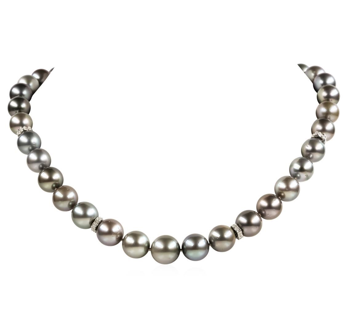 One graduated single strand pearl necklace 18.5' princess length, knotted with a tongue clasp & foldover safety containing 35 Tahitian pearls, 13.5mm to 11.0mm in size. The pearls are silver in color, green overtone with a good luster, round to near round, and mostly clean with very good matching. The featured pearl necklace has 14KT white gold clasp and rondels. Graded on the strand.Tahitian cultured pearls form in the Pinctada Margaritifera oysters. This species is native to the central and South Pacific Ocean but is generally raised in lagoons by pearl farmers. Tahitian cultured pearls take between two to four years to form. Sixty-Three prong set single cut diamonds, measuring 1.10 - 1.00 x 0.65mm (depth est.) approximate total weight of 63 Stones = 0.27ct. Graded in the setting. Color G - H Clarity SI-1 to SI-2 Cut Good. Total Weight of Diamonds 0.27ct.. Total Weight of 90.60gm GAS Appraised at $19,115.00.