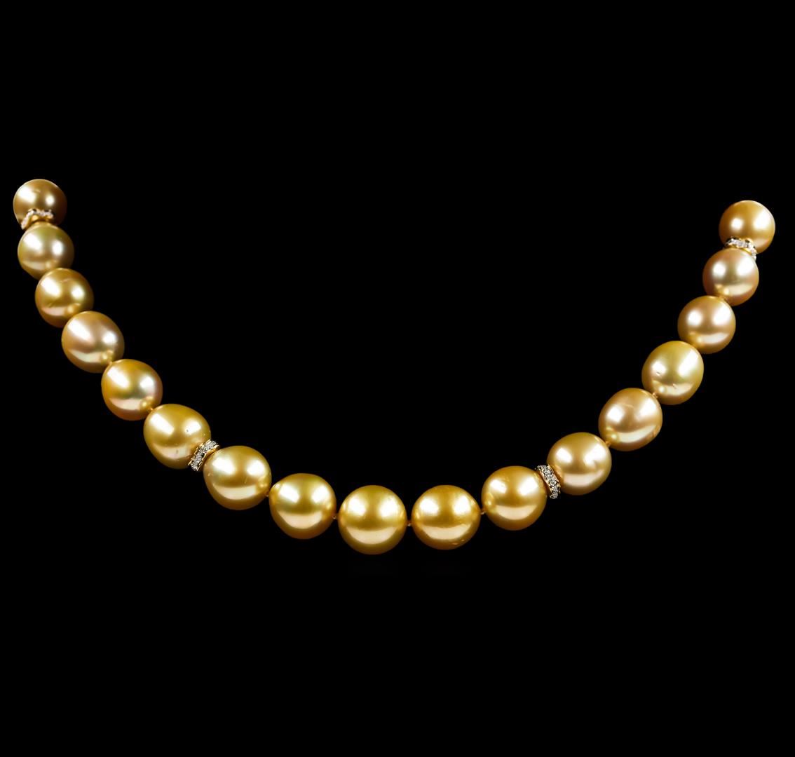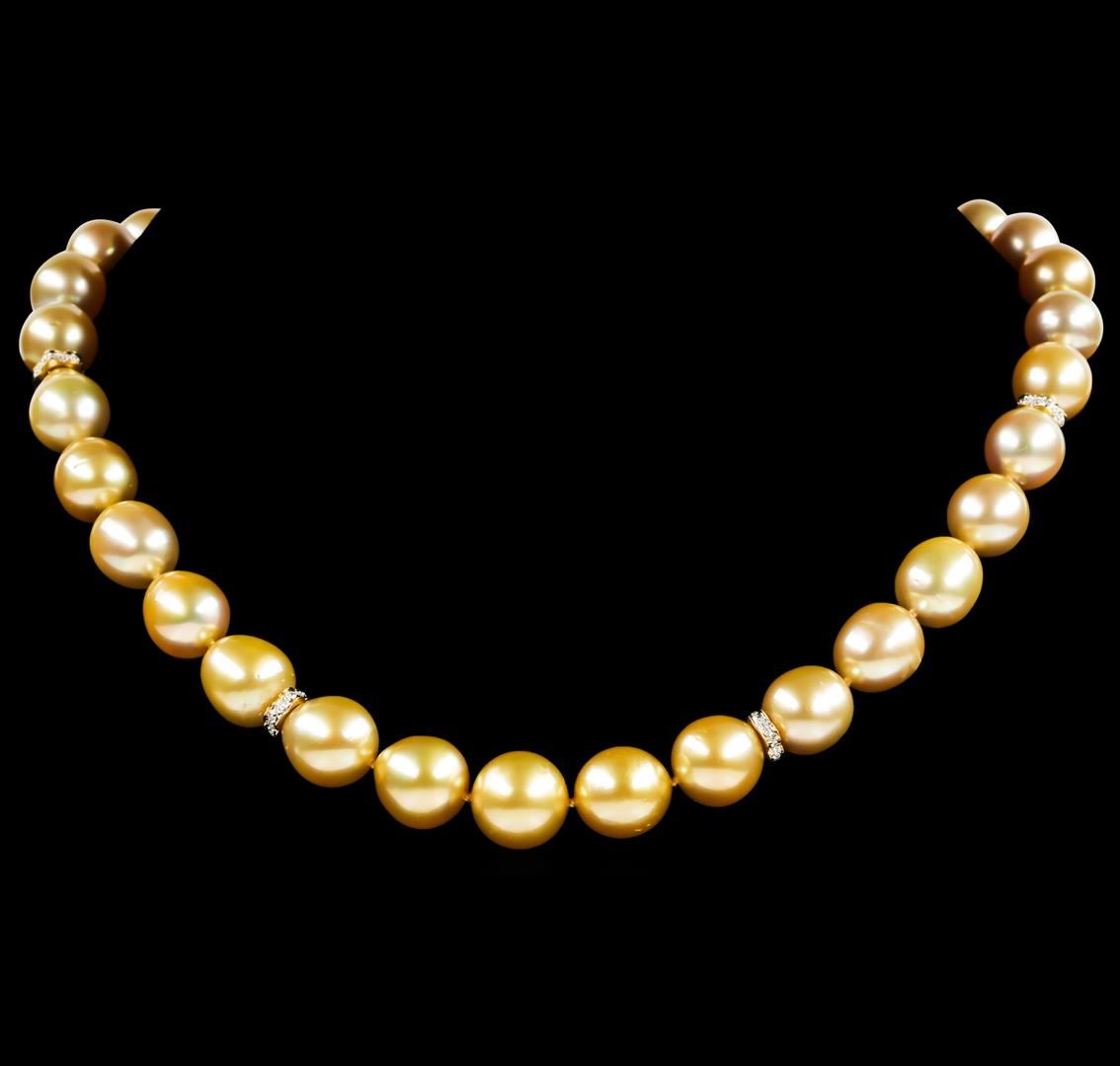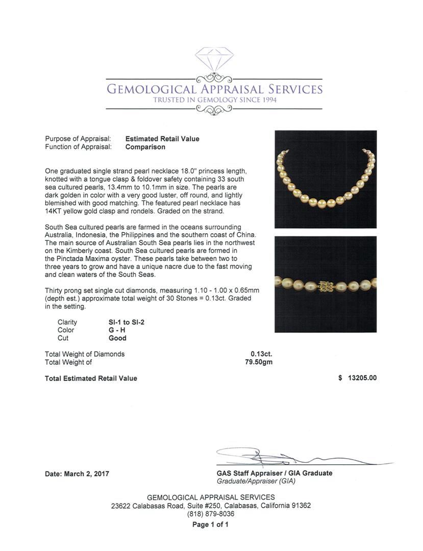 One graduated single strand pearl necklace 18.0' princess length, knotted with a tongue clasp & foldover safety containing 33 south sea cultured pearls, 13.4mm to 10.1mm in size. The pearls are dark golden in color with a very good luster, off round, and lightly blemished with good matching. The featured pearl necklace has 14KT yellow gold clasp and rondels. Graded on the strand.South Sea cultured pearls are farmed in the oceans surrounding Australia, Indonesia, the Philippines and the southern coast of China. The main source of Australian South Sea pearls lies in the northwest on the Kimberly coast. South Sea cultured pearls are formed in the Pinctada Maxima oyster. These pearls take between two to three years to grow and have a unique nacre due to the fast moving and clean waters of the South Seas. Thirty prong set single cut diamonds, measuring 1.10 - 1.00 x 0.65mm (depth est.) approximate total weight of 30 Stones = 0.13ct. Graded in the setting. Color G - H Clarity SI-1 to SI-2 Cut Good. Total Weight of Diamonds 0.13ct.. Total Weight of 79.50gm GAS Appraised at $13,205.00.