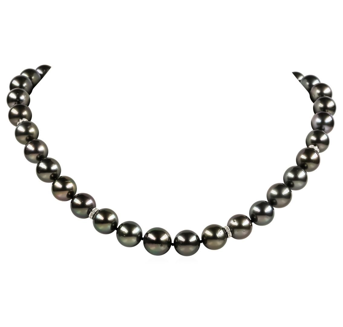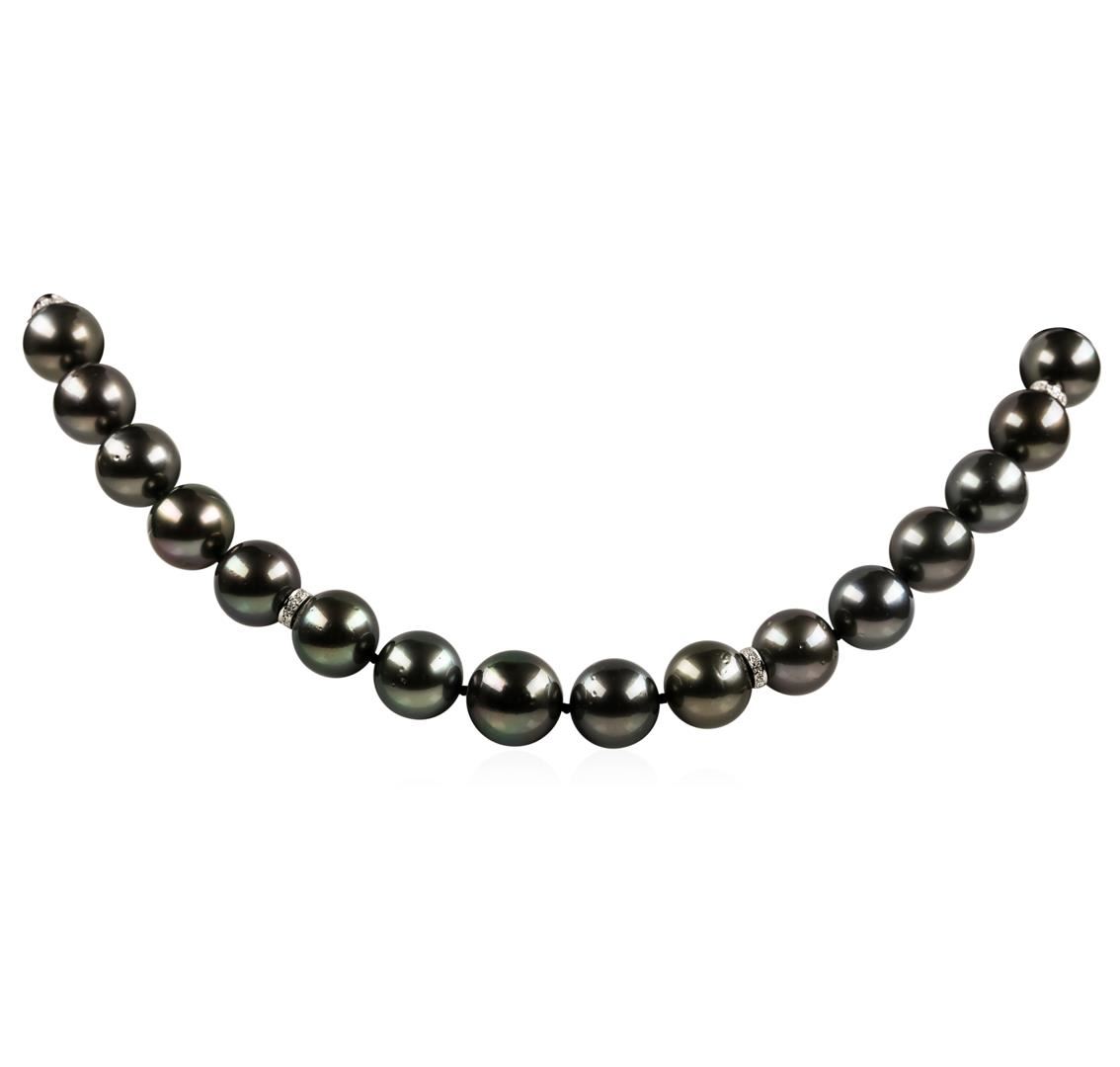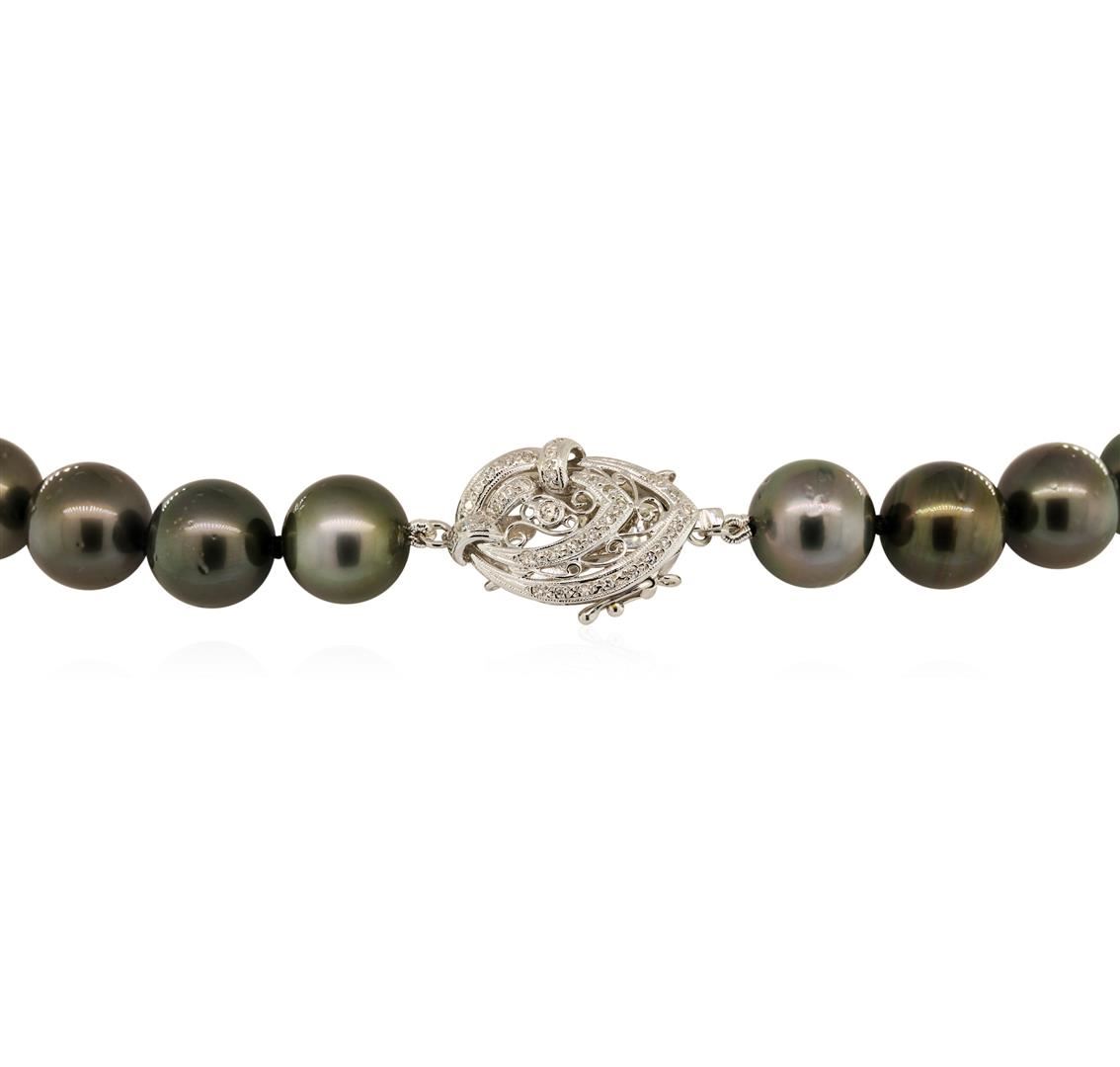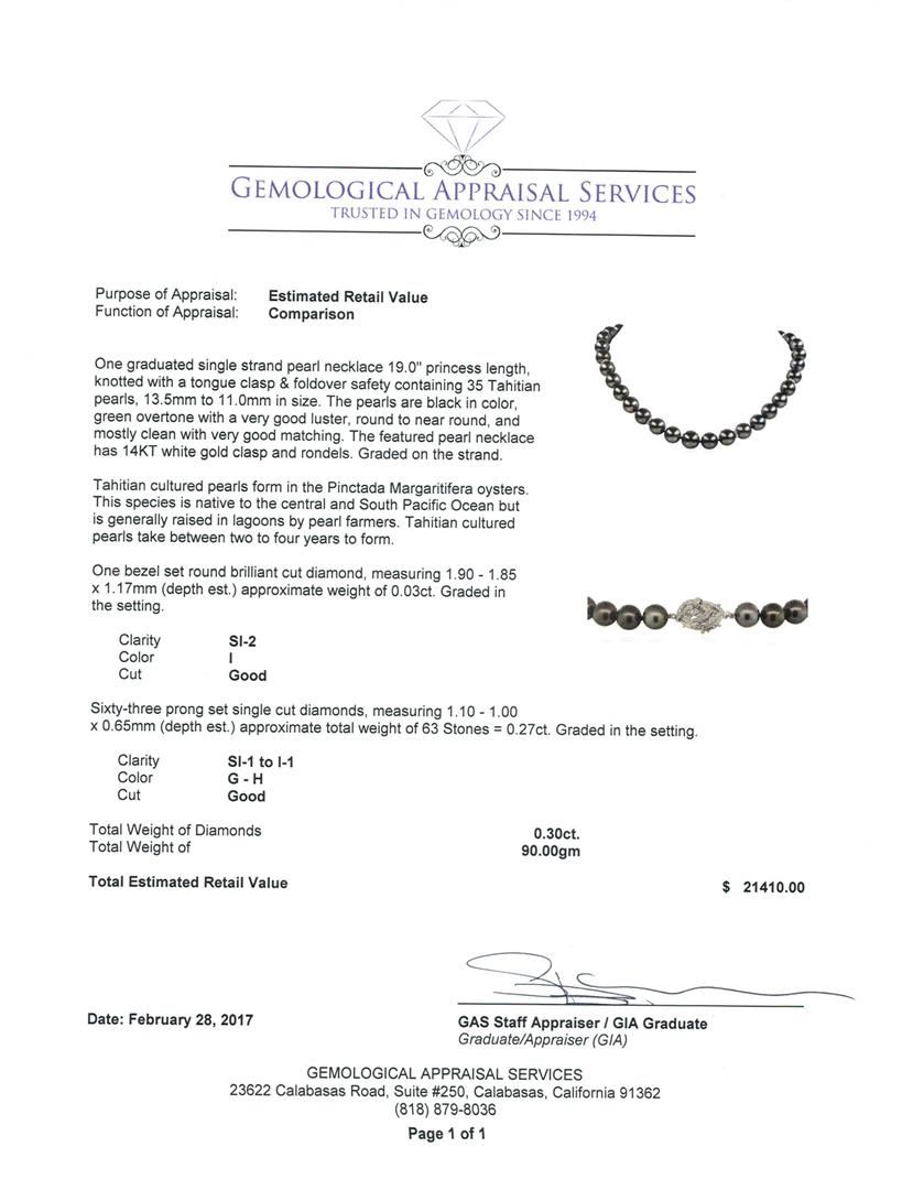 One graduated single strand pearl necklace 19.0' princess length, knotted with a tongue clasp & foldover safety containing 35 Tahitian pearls, 13.5mm to 11.0mm in size. The pearls are black in color, green overtone with a very good luster, round to near round, and mostly clean with very good matching. The featured pearl necklace has 14KT white gold clasp and rondels. Graded on the strand.Tahitian cultured pearls form in the Pinctada Margaritifera oysters. This species is native to the central and South Pacific Ocean but is generally raised in lagoons by pearl farmers. Tahitian cultured pearls take between two to four years to form. One bezel set round brilliant cut diamond, measuring 1.90 - 1.85 x 1.17mm (depth est.) approximate weight of 0.03ct. Graded in the setting. Color I Clarity SI-2 Cut Good Sixty-Three prong set single cut diamonds, measuring 1.10 - 1.00 x 0.65mm (depth est.) approximate total weight of 63 Stones = 0.27ct. Graded in the setting. Color G - H Clarity SI-1 to I-1 Cut Good. Total Weight of Diamonds 0.30ct.. Total Weight of 90.00gm GAS Appraised at $21,410.00.
