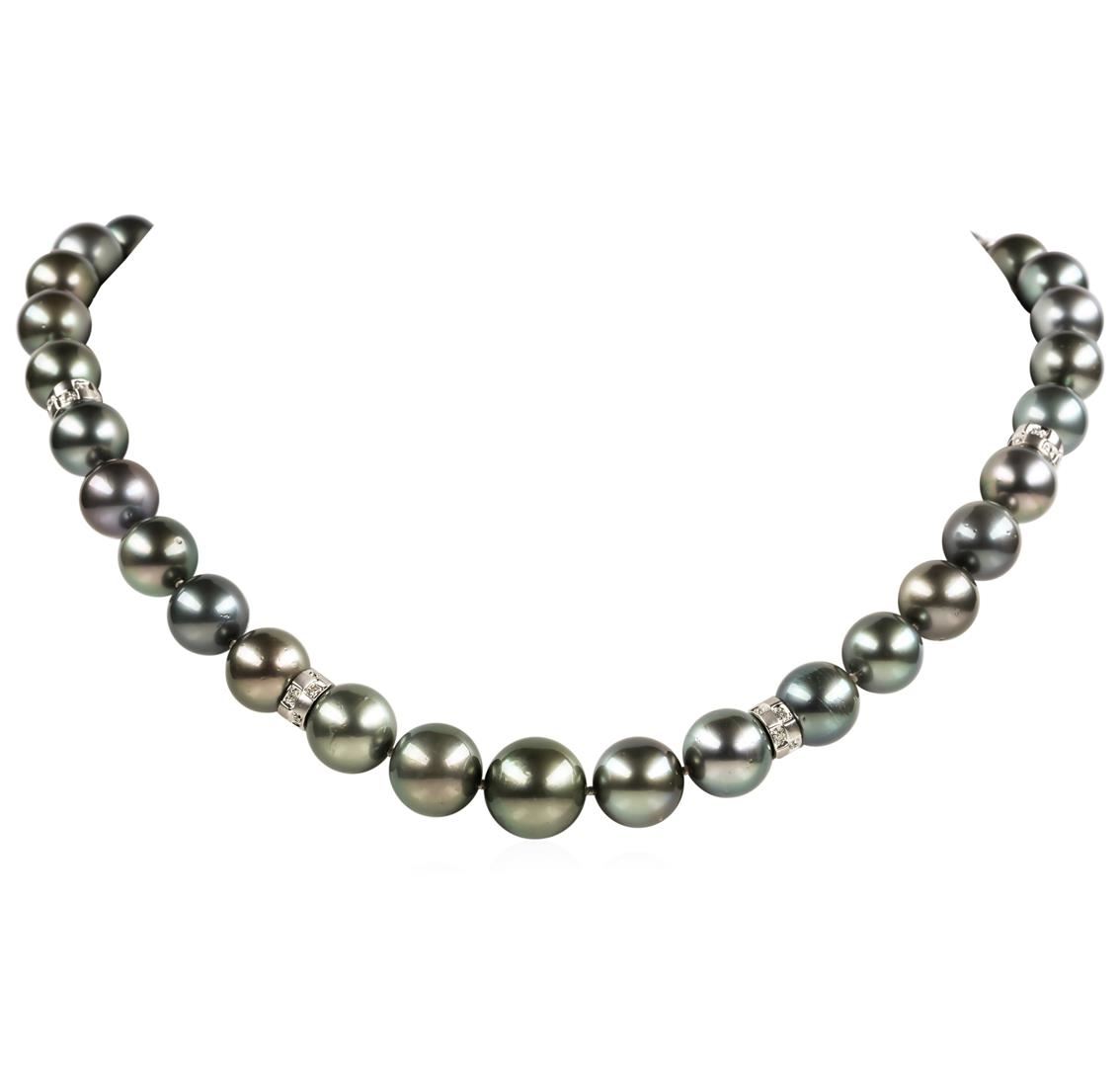 One graduated single strand pearl necklace 19.0' princess length, knotted with a tongue clasp & foldover safety containing 35 Tahitian pearls, 14.7mm to 11.0mm in size. The pearls are silver in color, green overtone with a very good luster, round to near round, and mostly clean with very good matching. The featured pearl necklace has 14KT white gold clasp and rondels. Graded on the strand.Tahitian cultured pearls form in the Pinctada Margaritifera oysters. This species is native to the central and South Pacific Ocean but is generally raised in lagoons by pearl farmers. Tahitian cultured pearls take between two to four years to form. One bezel set round brilliant cut diamond, measuring 2.20 - 2.15 x 1.35mm (depth est.) approximate weight of 0.04ct. Graded in the setting. Color H Clarity SI-1 Cut Good Ninety-Two prong set single cut diamonds, measuring 1.10 - 1.00 x 0.65mm (depth est.) approximate total weight of 92 Stones = 0.40ct. Graded in the setting. Color G - H Clarity SI-1 to I-1 Cut Good. Total Weight of Diamonds 0.44ct.. Total Weight of 93.00gm GAS Appraised at $24,120.00.