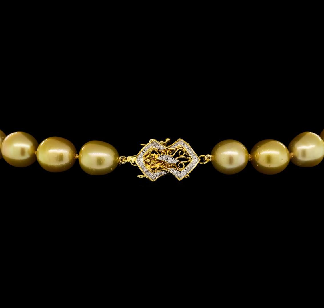 One graduated single strand pearl necklace 18.5' princess length, knotted with a tongue clasp containing 33 south sea cultured pearls, 13.5mm to 10.2mm in size. The pearls are dark golden in color with a good luster, off round, and mostly clean with good matching. The featured pearl necklace has 14KT yellow gold clasp and rondels. Graded on the strand.South Sea cultured pearls are farmed in the oceans surrounding Australia, Indonesia, the Philippines and the southern coast of China. The main source of Australian South Sea pearls lies in the northwest on the Kimberly coast. South Sea cultured pearls are formed in the Pinctada Maxima oyster. These pearls take between two to three years to grow and have a unique nacre due to the fast moving and clean waters of the South Seas. Fifty-Two prong set single cut diamonds, measuring 1.10 - 1.00 x 0.65mm (depth est.) approximate total weight of 52 Stones = 0.23ct. Graded in the setting. Color G - H Clarity VS-2 to SI-1 Cut Good. Total Weight of Diamonds 0.23ct.. Total Weight of 83.80gm GAS Appraised at $15,970.00.