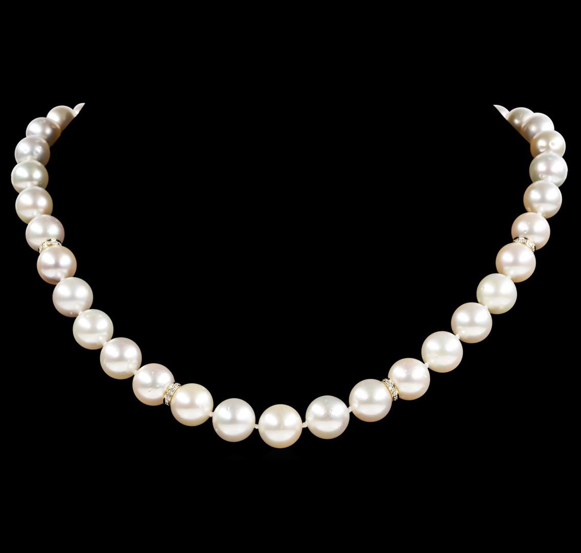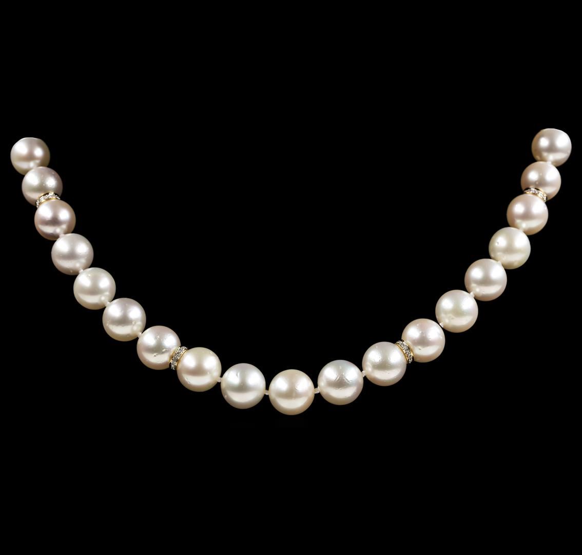 One graduated single strand pearl necklace 18.5' princess length, knotted with a ball clasp containing 39 south sea cultured pearls, 12.0mm to 8.9mm in size. The pearls are light cream in color with a very good luster, round to near round, and lightly blemished with very good matching. The featured pearl necklace has 14KT yellow gold clasp and rondels. Graded on the strand.South Sea cultured pearls are farmed in the oceans surrounding Australia, Indonesia, the Philippines and the southern coast of China. The main source of Australian South Sea pearls lies in the northwest on the Kimberly coast. South Sea cultured pearls are formed in the Pinctada Maxima oyster. These pearls take between two to three years to grow and have a unique nacre due to the fast moving and clean waters of the South Seas. Ten bezel set round brilliant cut diamonds, measuring 1.10 - 1.00 x 0.65mm (depth est.) approximate total weight of 10 Stones = 0.04ct. Graded in the setting. Color H - I Clarity VS-2 to SI-1 Cut Good Forty prong set single cut diamonds, measuring 1.10 - 1.00 x 0.65mm (depth est.) approximate total weight of 40 Stones = 0.18ct. Graded in the setting. Color G - H Clarity VS-2 to SI-1 Cut Good. Total Weight of Diamonds 0.22ct.. Total Weight of 71.80gm GAS Appraised at $27,030.00.