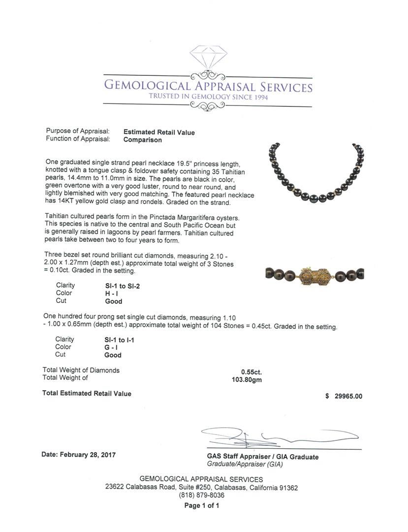 One graduated single strand pearl necklace 19.5' princess length, knotted with a tongue clasp & foldover safety containing 35 Tahitian pearls, 14.4mm to 11.0mm in size. The pearls are black in color, green overtone with a very good luster, round to near round, and lightly blemished with very good matching. The featured pearl necklace has 14KT yellow gold clasp and rondels. Graded on the strand.Tahitian cultured pearls form in the Pinctada Margaritifera oysters. This species is native to the central and South Pacific Ocean but is generally raised in lagoons by pearl farmers. Tahitian cultured pearls take between two to four years to form. Three bezel set round brilliant cut diamonds, measuring 2.10 - 2.00 x 1.27mm (depth est.) approximate total weight of 3 Stones = 0.10ct. Graded in the setting. Color H - I Clarity SI-1 to SI-2 Cut Good One Hundred Four prong set single cut diamonds, measuring 1.10 - 1.00 x 0.65mm (depth est.) approximate total weight of 104 Stones = 0.45ct. Graded in the setting. Color G - I Clarity SI-1 to I-1 Cut Good. Total Weight of Diamonds 0.55ct.. Total Weight of 103.80gm GAS Appraised.