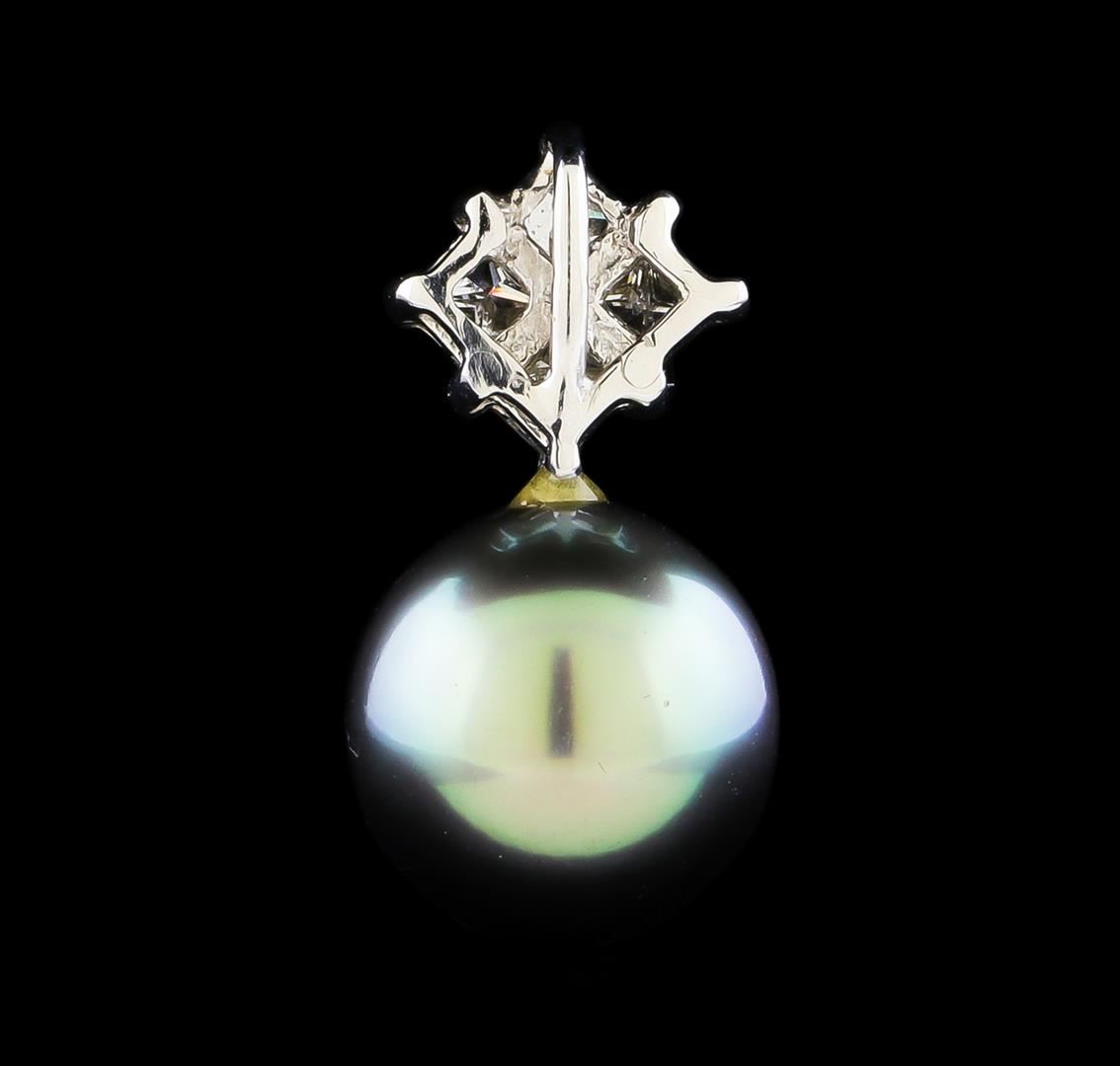 One electronically tested 14KT white gold lady's cast fashion pendant with a bright polish finish. The featured lady's pendant has a 18.75 millimeter drop in length Condition is new, good workmanship. Containing: One south sea cultured pearl, 9.8mm to 10.0mm in size. The pearl is black in color, green overtone with a very good luster, round, and clean. Graded in the setting. Four invisible set princess cut diamonds, measuring 2.60 x 2.50 x 1.78mm (depth est.) approximate total weight of 4 Stones = 0.40ct. Graded in the setting. Clarity: VS-2 to SI-1. Color: G - Very Good. Total Weight of Diamonds 0.40ct. Total Weight of Pendant 2.00gm. GAS Appraised at $1,180.00.