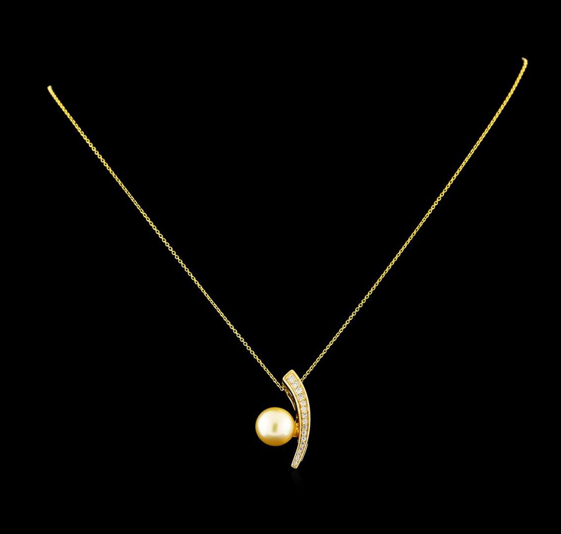 One electronically tested 14KT yellow gold ladies cast & assembled south sea cultured pearl & diamond pendant with chain. The asymmetrical pendant features a south sea cultured pearl paired with an elegant diamond ribbon, completed by a hidden bail. The pendant is supported by sixteen inch length 14KT yellow gold designer style chain, terminating in a spring ring clasp. Bright polish finish. Trademark is BH. Identified with markings of "14K". Condition is new, good workmanship. Containing: One south sea cultured pearl, 10.0mm in size to 10.0mm in size. The pearl is cream in color with a very good luster, round, mostly clean Graded in the setting. South Sea Cultured Pearls are farmed in the ocean waters throughout Australia, the Philippines, Indonesia, and the southern coast of China. Australia's main culturing industry is located near the city of Broome, in the northwest, on the Kimberley coast. South Sea cultured pearls form in the Pinctada Maxima oyster, the world's largest (up to 34cm) pearl cultivating oyster. The Indian & Pacific Ocean, the Java & the South China Sea, are the native waters of the Pinctada Maxima oyster. There are two varieties of the Pinctada Maxima: the Gold Lipped oyster which produces the golden color pearls, and the Silver Lipped oyster which produces white color pearls. The South Sea cultured pearl takes from about two to three years to grow. It is produced by inserting a large bead into the oyster when it is about two years old. The South Sea pearl nacre has a unique satiny appearance, due partly to the fast moving and clean waters on the South Seas. Sixteen prong set round brilliant cut diamonds, measuring 1.70 - 1.10 x 0.84mm (depth est.) approximate total weight of 16 Stones = 0.18ct. Graded in the setting. Clarity: SI-1 to I-1. Color: F - H. Total Weight of Diamonds 0.18ct. Total Weight of Pendant With Chain 6.73gm. AIG Appraised at $2,740.00.