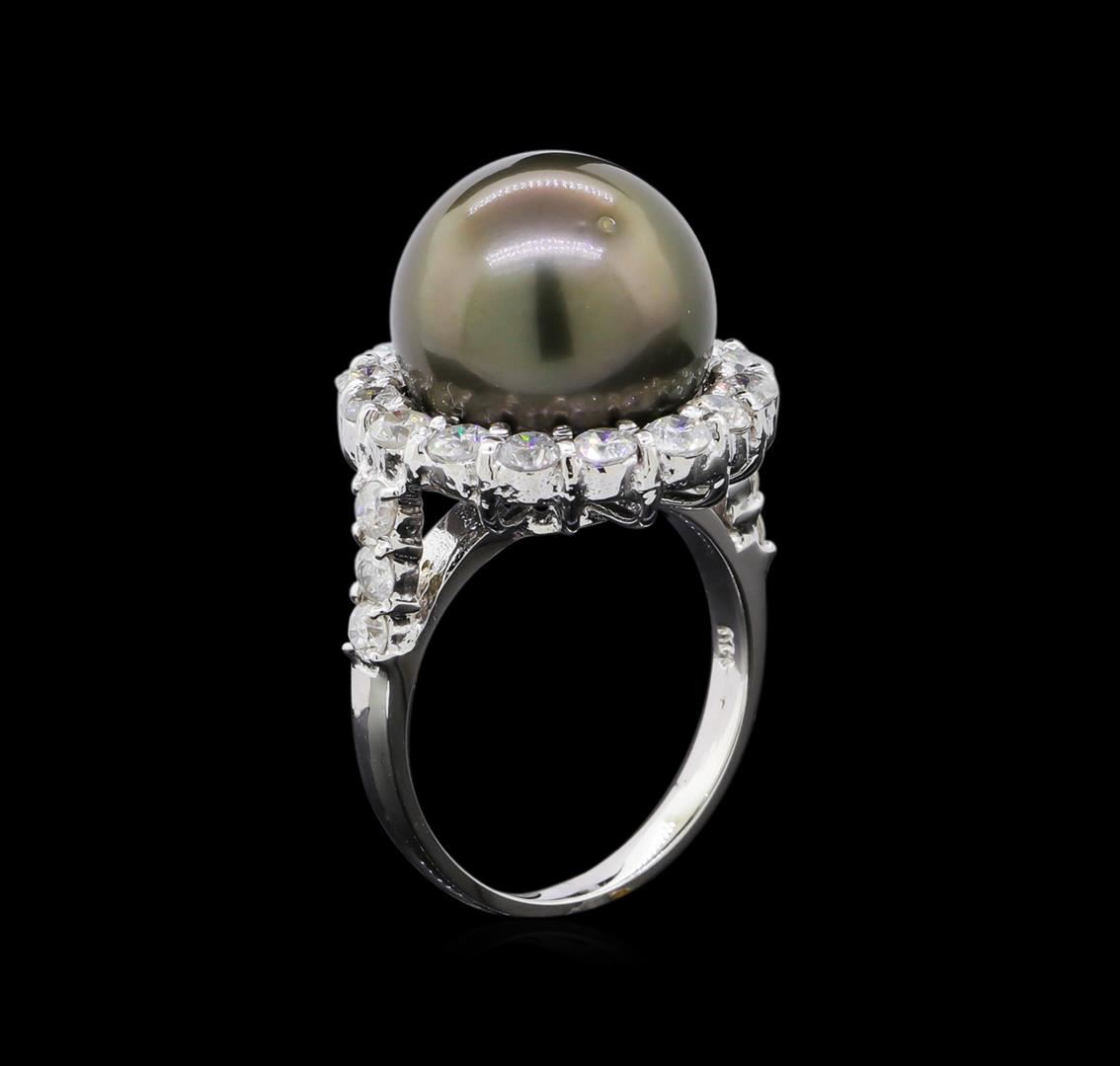 One electronically tested 14KT white gold ladies cast Tahitian cultured pearl & diamond ring with a bright polish finish. The featured Tahitian cultured pearl is set within a diamond bezel supported by diamond set shoulders, completed by a two millimeter wide band. Trademark is USA SG. Identified with markings of "K14". Condition is new, good workmanship. Containing: One Tahitian cultured pearl, 12.5mm in size. The pearl is black in color with a very good luster, round, mostly clean Graded in the setting. Tahitian cultured pearls form in the large "Black Lipped" Pinctada Margaritifera oyster, which is about twice the size of the Japanese Akoya oyster. This warm water species from across the central and South Pacific Ocean is at home in the bays and lagoons of the islands & atolls of French Polynesia. Tahitian cultured pearl farmers generally raise their oysters in lagoons. Tahitian cultured pearls take from two to four years to form. Black pearls are known for their iridescent, vibrant, almost metallic natural colors, unique among saltwater cultured pearls. Though commonly called "Tahitian" pearls, they are actually gray, to a lighter or darker degree. Tahitian pearls have the unique ability to display a variety of colors at the same time, which can be seen glistening on their surface. Twenty-Two prong set round brilliant cut diamonds approximate total weight of 22 Stones = 1.54ct. Graded in the setting. Clarity: I-1 to I-3. Color: G - I. Total Weight of Diamonds 1.54ct. Total Weight of Ring 8.21gm. AIG Appraised at $5,585.00.