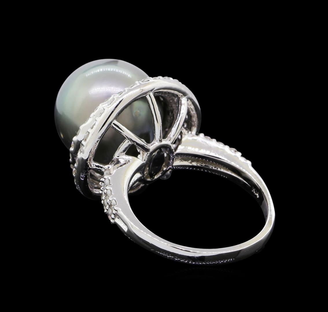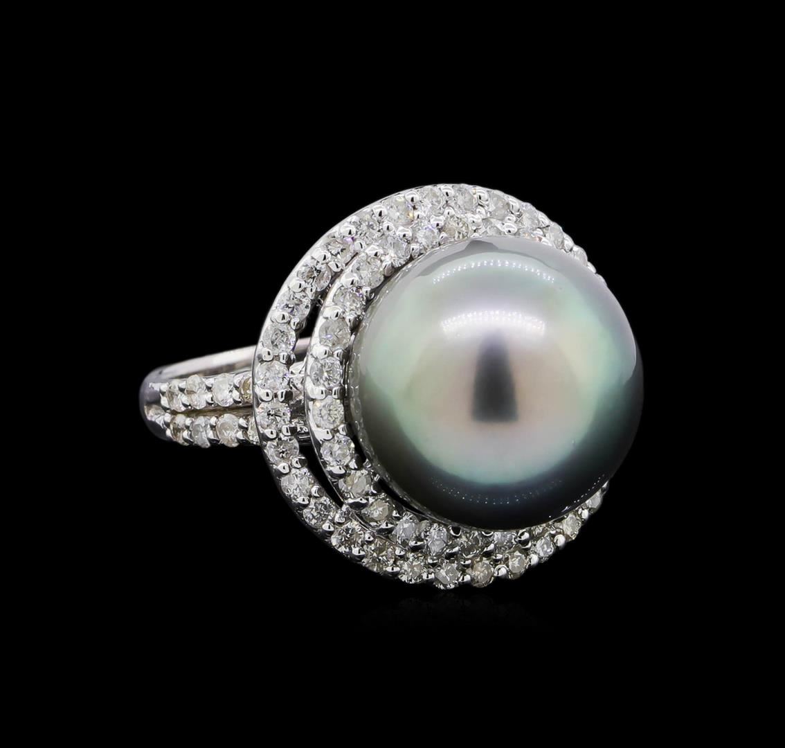 One electronically tested 14KT white gold ladies cast Tahitian cultured pearl & diamond ring with a bright polish finish. The featured Tahitian cultured pearl is set within a stylized diamond bezel supported by split diamond set shoulders, completed by a two millimeter wide band. Trademark is USA SG. Identified with markings of "K14". Condition is new, good workmanship. Containing: One Tahitian cultured pearl, 14.0mm in size. The pearl is black in color with a very good luster, round, mostly clean Graded in the setting. Tahitian cultured pearls form in the large "Black Lipped" Pinctada Margaritifera oyster, which is about twice the size of the Japanese Akoya oyster. This warm water species from across the central and South Pacific Ocean is at home in the bays and lagoons of the islands & atolls of French Polynesia. Tahitian cultured pearl farmers generally raise their oysters in lagoons. Tahitian cultured pearls take from two to four years to form. Black pearls are known for their iridescent, vibrant, almost metallic natural colors, unique among saltwater cultured pearls. Though commonly called "Tahitian" pearls, they are actually gray, to a lighter or darker degree. Tahitian pearls have the unique ability to display a variety of colors at the same time, which can be seen glistening on their surface. Seventy-Four prong set round brilliant cut diamonds approximate total weight of 74 Stones = 1.31ct. Graded in the setting. Clarity: I-1 to I-2. Color: G - I. Total Weight of Diamonds 1.31ct. Total Weight of Ring 11.49gm. AIG Appraised at $7,055.00.
