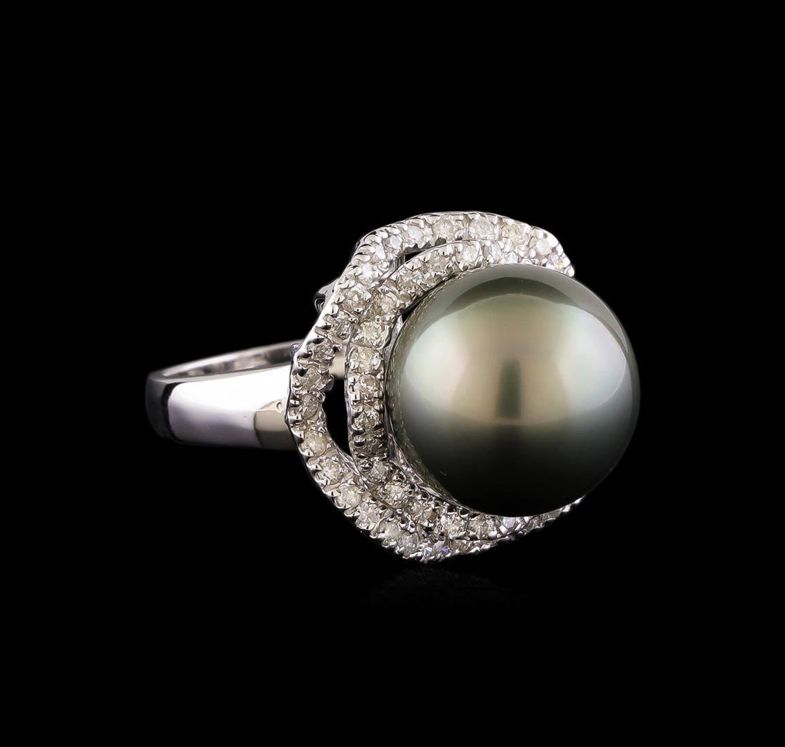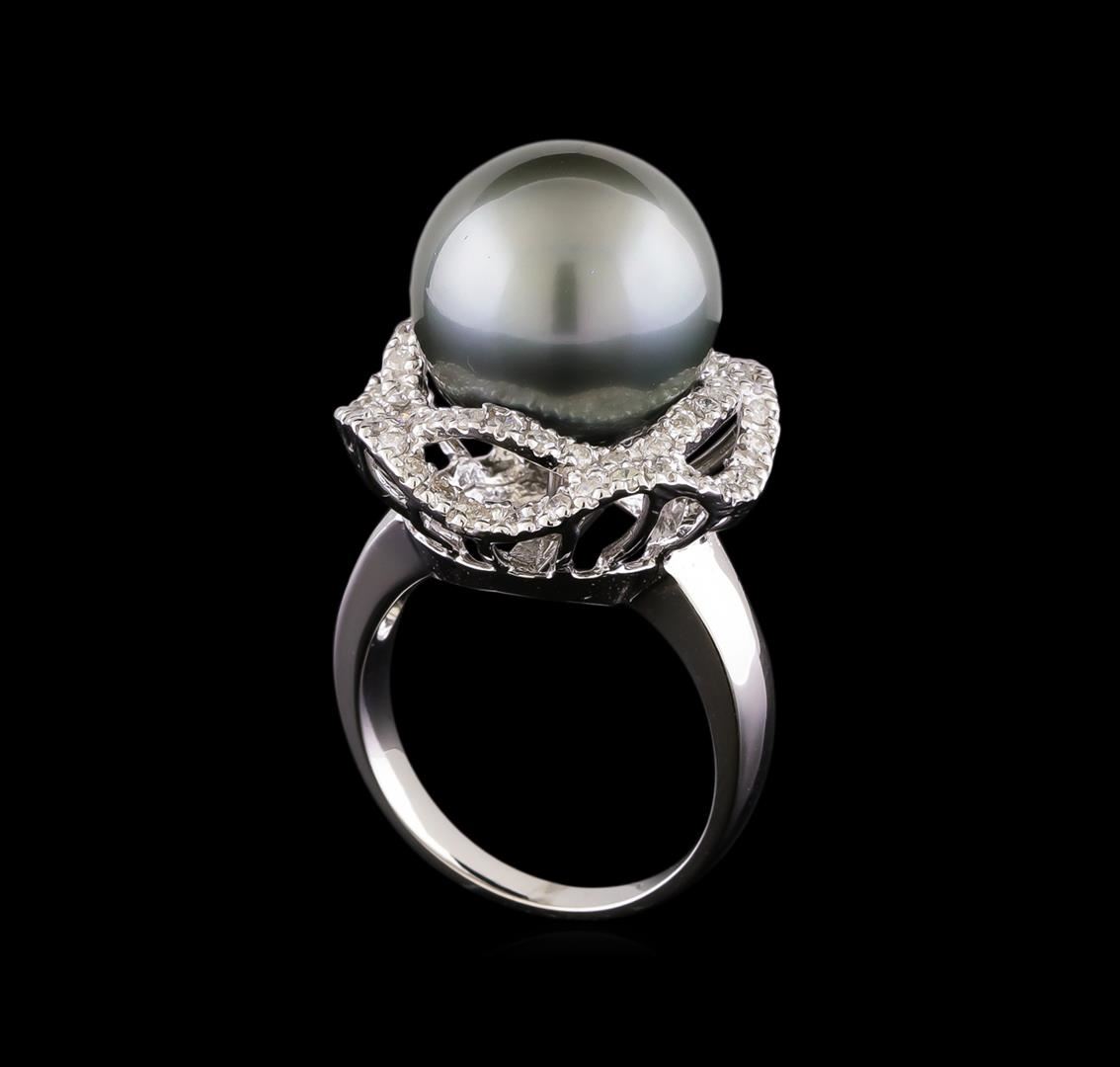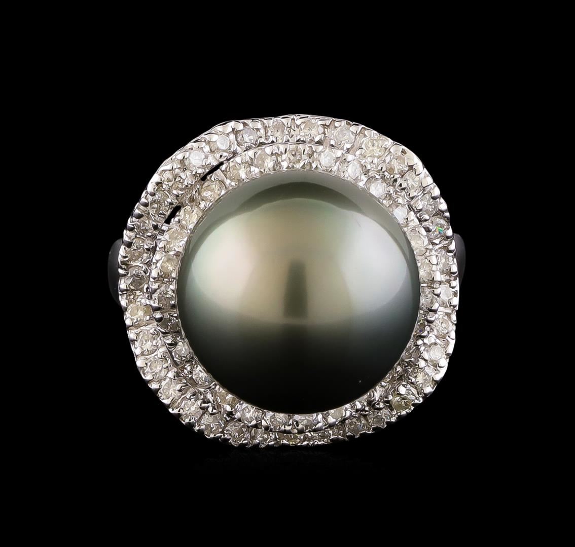 One electronically tested 14KT white gold ladies cast & assembled Tahitian cultured pearl & diamond ring with a bright polish finish. The featured Tahitian cultured pearl is set within stylized diamond bezels supported by a lattice under gallery and tapering shoulders, completed by a two millimeter wide band. Identified with markings of "K14". Condition is new, good workmanship. Containing: One Tahitian cultured pearl, 14.0mm in size. The pearl is black in color with a very good luster, round, clean Graded in the setting. Tahitian cultured pearls form in the large "Black Lipped" Pinctada Margaritifera oyster, which is about twice the size of the Japanese Akoya oyster. This warm water species from across the central and South Pacific Ocean is at home in the bays and lagoons of the islands & atolls of French Polynesia. Tahitian cultured pearl farmers generally raise their oysters in lagoons. Tahitian cultured pearls take from two to four years to form. Black pearls are known for their iridescent, vibrant, almost metallic natural colors, unique among saltwater cultured pearls. Though commonly called "Tahitian" pearls, they are actually gray, to a lighter or darker degree. Tahitian pearls have the unique ability to display a variety of colors at the same time, which can be seen glistening on their surface. Sixty-One prong set round brilliant cut diamonds approximate total weight of 61 Stones = 0.82ct. Graded in the setting. Clarity: I-1 to I-2. Color: F - H. Total Weight of Diamonds 0.82ct. Total Weight of Ring 10.98gm. AIG Appraised at $5,940.00.
