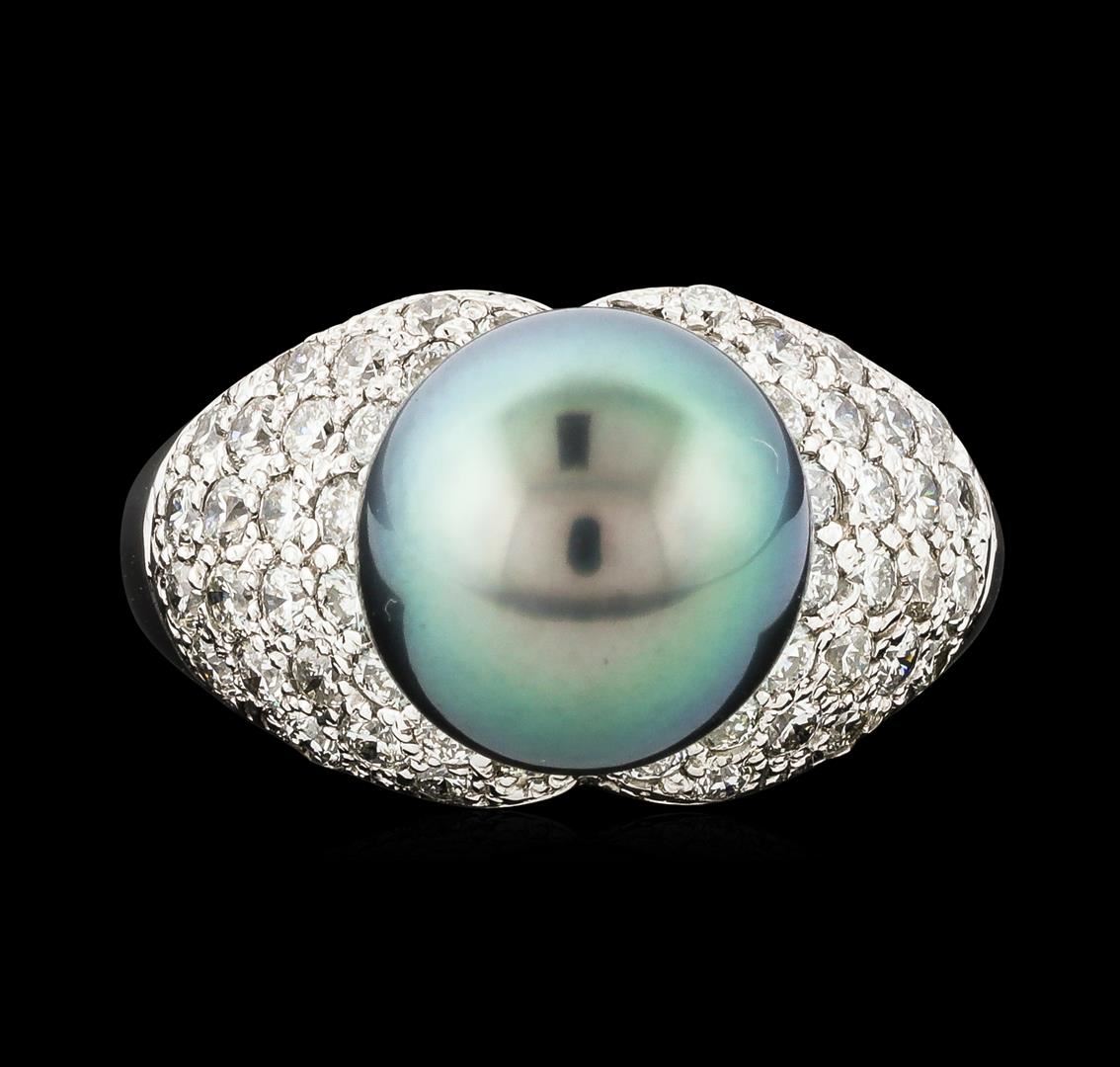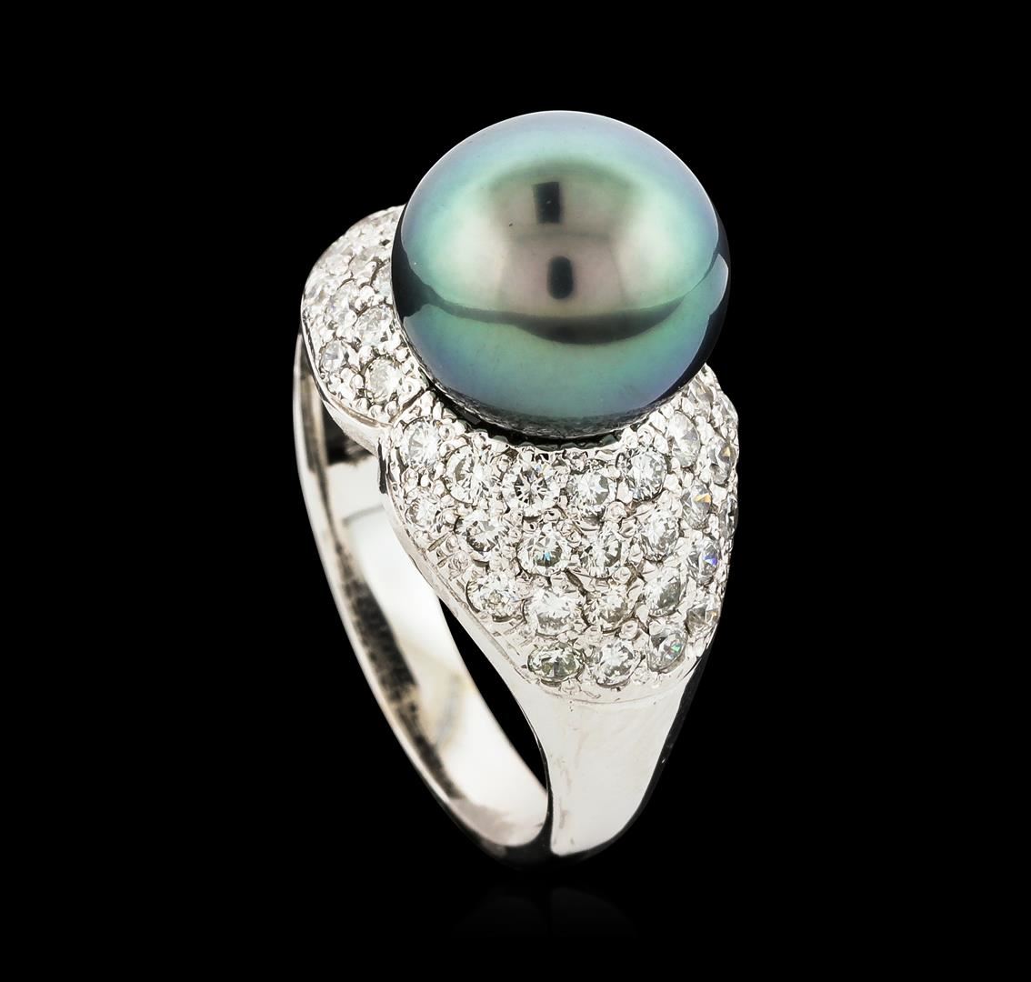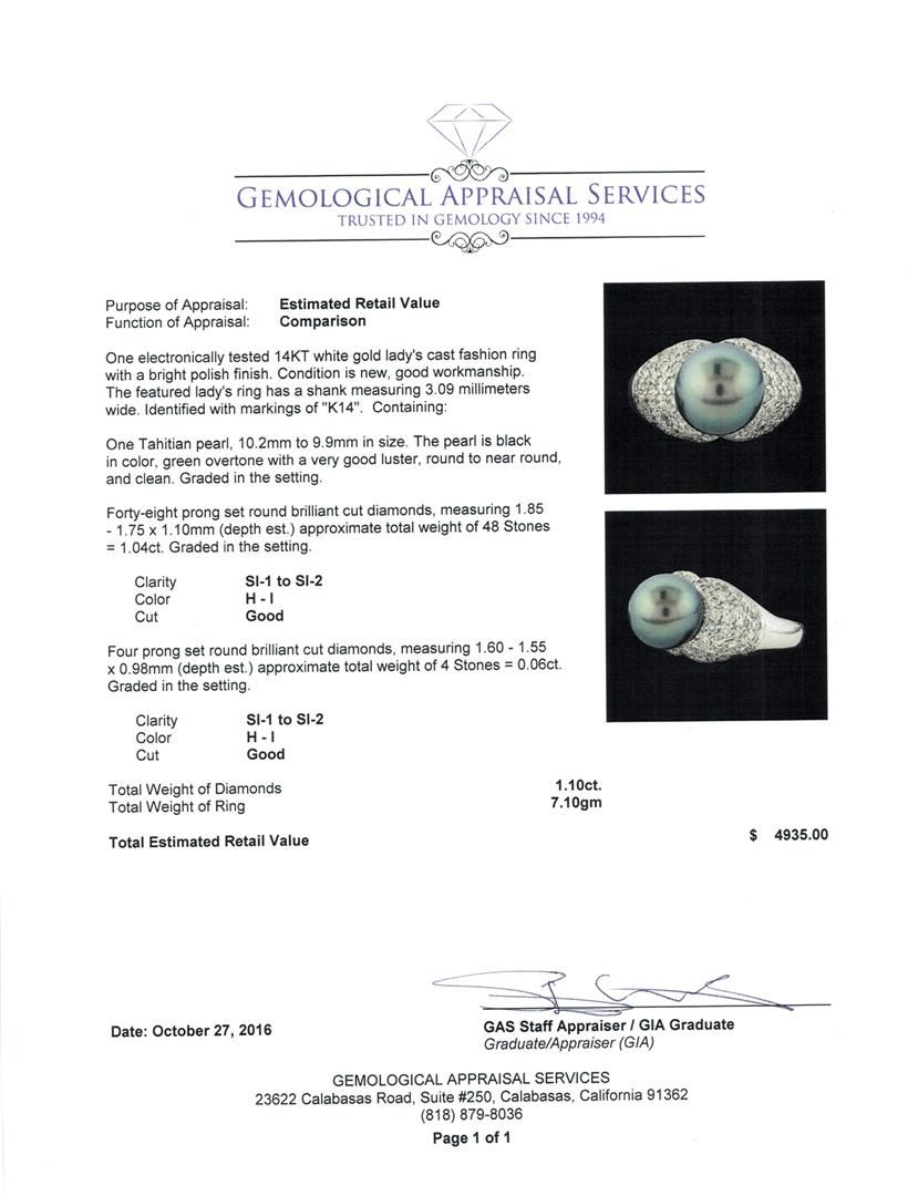 One electronically tested 14KT white gold lady's cast fashion ring with a bright polish finish. The featured lady's ring has a shank measuring 3.09 millimeters wide. Identified with markings of 'K14'. Condition is new, good workmanship. Containing: One Tahitian pearl, 10.2mm to 9.9mm in size. The pearl is black in color, green overtone with a very good luster, round to near round, and clean. Graded in the setting. Forty-Eight prong set round brilliant cut diamonds, measuring 1.85 - 1.75 x 1.10mm (depth est.) approximate total weight of 48 Stones = 1.04ct. Graded in the setting. Clarity SI-1 to SI-2. Color: H - I Cut Good Four prong set round brilliant cut diamonds, measuring 1.60 - 1.55 x 0.98mm (depth est.) approximate total weight of 4 Stones = 0.06ct. Graded in the setting. Clarity SI-1 to SI-2. Color: H - I Cut Good. Total Weight of Diamonds 1.10ct.. Total Weight of Ring 7.10gm. GAS Appraised at $4,935.00.