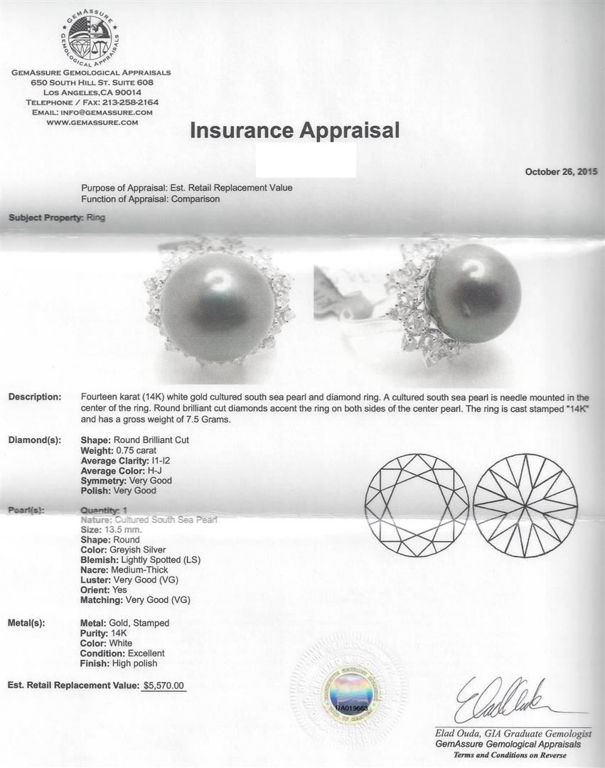 Fourteen karat (14K) white gold cultured south sea pearl and diamond ring. A cultured south sea pearl is needle mounted in the center of the ring. Round brilliant cut diamonds accent the ring on both sides of the center pearl. The ring is cast stamped "14K" and has a gross weight of 7.5 Grams. Diamond(s): Shape: Round Brilliant Cut. Weight: 0.75 carat. Average Clarity: I1-I2. Average Color: H-J. Symmetry: Very Good. Polish: Very Good. Pearl(s): Quantity: 1. Nature: Cultured South Sea Pearl. Size: 13.5 mm. Shape: Round. Color: Greyish Silver. Blemish: Lightly Spotted (LS). Nacre: Medium-Thick. Luster: Very Good (VG). Orient: Yes. Matching: Very Good (VG). Metal(s): Metal: Gold, Stamped. Purity: 14K. Color: White. Condition: Excellent. Finish: High polish. GGA Appraised.