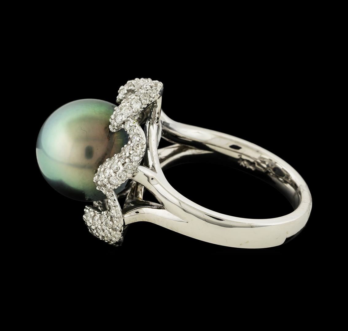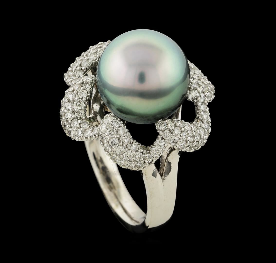 One electronically tested 14KT white gold lady's cast fashion ring with a swirled basket halo with a bright polish finish. The featured lady's ring has a split shank measuring 3.05 millimeters wide. Identified with markings of 'K14'. Condition is new, good workmanship. Containing: One Tahitian pearl, 11.8mm to 11.7mm in size. The pearl is peacock in color, green overtone with a good luster, round, and clean. Graded in the setting. One Hundred Twenty-Six prong set round brilliant cut diamonds, measuring 1.30 - 1.20 x 0.78mm (depth est.) approximate total weight of 126 Stones = 0.93ct. Graded in the setting. Clarity SI-1 to SI-2. Color: G - H Cut Good. Total Weight of Diamonds 0.93ct.. Total Weight of Ring 9.40gm. GAS Appraised at $6,265.00.