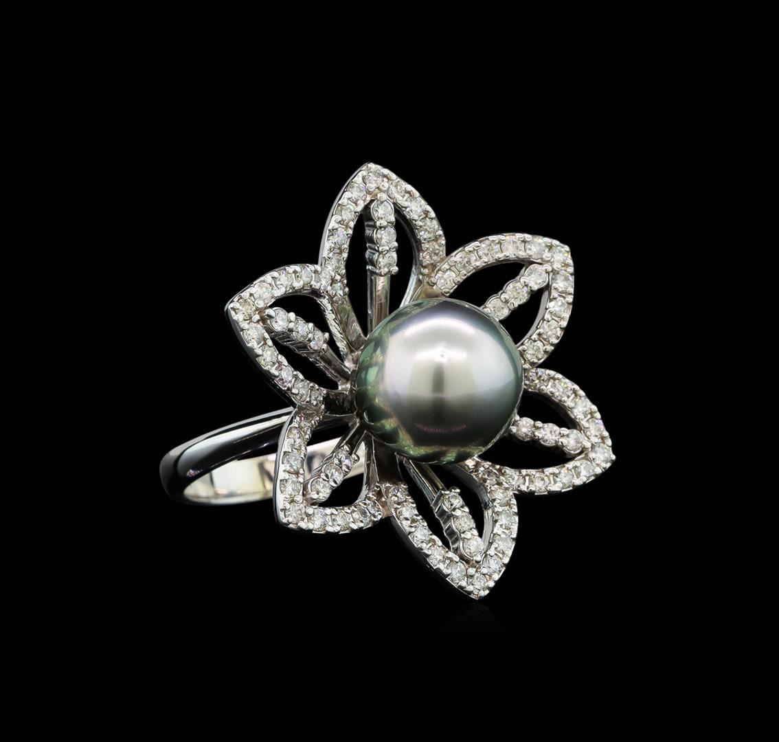 One electronically tested 14KT white gold lady's cast flower design ring with a bright polish finish. The featured lady's ring has a shank measuring 2.81 millimeters wide. Identified with markings of '585'. Condition is new, good workmanship. Containing: One Tahitian pearl, 10.3mm to 10.2mm in size. The pearl is peacock in color, green overtone with a very good luster, round to near round, and mostly clean. Graded in the setting. Seventy-Eight prong set round brilliant cut diamonds, measuring 1.45 - 1.35 x 0.87mm (depth est.) approximate total weight of 78 Stones = 0.81ct. Graded in the setting. Clarity SI-1 to I-1. Color: G - H Cut Good. Total Weight of Diamonds 0.81ct.. Total Weight of Ring 8.40gm. GAS Appraised at $4,765.00.