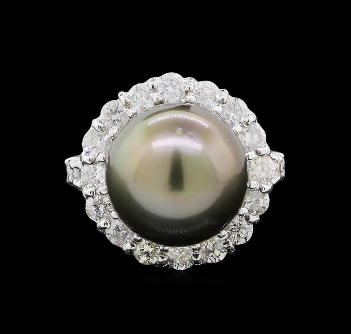 One electronically tested 14KT white gold ladies cast Tahitian cultured pearl & diamond ring with a bright polish finish. The featured Tahitian cultured pearl is set within a diamond bezel supported by diamond set shoulders, completed by a two millimeter wide band. Trademark is USA SG. Identified with markings of "K14". Condition is new, good workmanship. Containing: One Tahitian cultured pearl, 12.5mm in size. The pearl is black in color with a very good luster, round, mostly clean Graded in the setting. Tahitian cultured pearls form in the large "Black Lipped" Pinctada Margaritifera oyster, which is about twice the size of the Japanese Akoya oyster. This warm water species from across the central and South Pacific Ocean is at home in the bays and lagoons of the islands & atolls of French Polynesia. Tahitian cultured pearl farmers generally raise their oysters in lagoons. Tahitian cultured pearls take from two to four years to form. Black pearls are known for their iridescent, vibrant, almost metallic natural colors, unique among saltwater cultured pearls. Though commonly called "Tahitian" pearls, they are actually gray, to a lighter or darker degree. Tahitian pearls have the unique ability to display a variety of colors at the same time, which can be seen glistening on their surface. Twenty-Two prong set round brilliant cut diamonds approximate total weight of 22 Stones = 1.54ct. Graded in the setting. Clarity: I-1 to I-3. Color: G - I. Total Weight of Diamonds 1.54ct. Total Weight of Ring 8.21gm. AIG Appraised at $5,585.00.