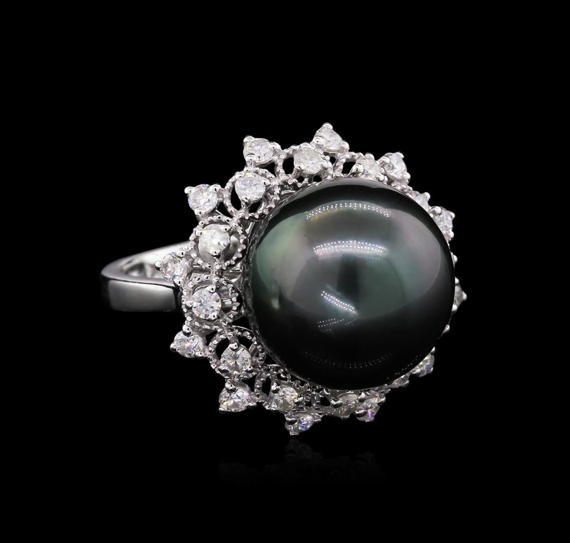 Fourteen karat (14K) white gold cultured south sea pearl and diamond ring. A cultured south sea pearl is needle mounted in the center of the ring. Round brilliant cut diamonds accent the ring on both sides of the center pearl. The ring is cast stamped "14K" and has a gross weight of 7.5 Grams. Diamond(s): Shape: Round Brilliant Cut. Weight: 0.75 carat. Average Clarity: I1-I2. Average Color: H-J. Symmetry: Very Good. Polish: Very Good. Pearl(s): Quantity: 1. Nature: Cultured South Sea Pearl. Size: 13.5 mm. Shape: Round. Color: Greyish Silver. Blemish: Lightly Spotted (LS). Nacre: Medium-Thick. Luster: Very Good (VG). Orient: Yes. Matching: Very Good (VG). Metal(s): Metal: Gold, Stamped. Purity: 14K. Color: White. Condition: Excellent. Finish: High polish. GGA Appraised.