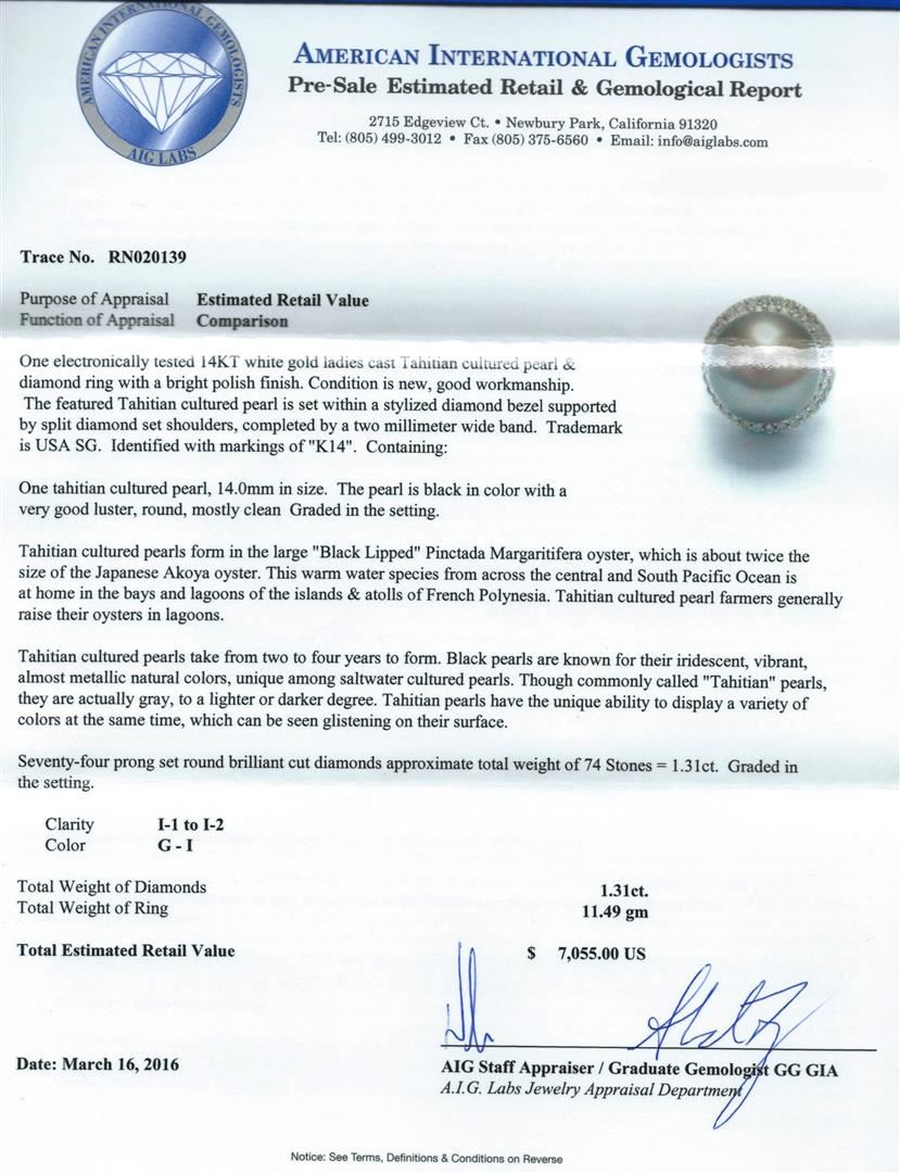 One electronically tested 14KT white gold ladies cast Tahitian cultured pearl & diamond ring with a bright polish finish. The featured Tahitian cultured pearl is set within a stylized diamond bezel supported by split diamond set shoulders, completed by a two millimeter wide band. Trademark is USA SG. Identified with markings of "K14". Condition is new, good workmanship. Containing: One Tahitian cultured pearl, 14.0mm in size. The pearl is black in color with a very good luster, round, mostly clean Graded in the setting. Tahitian cultured pearls form in the large "Black Lipped" Pinctada Margaritifera oyster, which is about twice the size of the Japanese Akoya oyster. This warm water species from across the central and South Pacific Ocean is at home in the bays and lagoons of the islands & atolls of French Polynesia. Tahitian cultured pearl farmers generally raise their oysters in lagoons. Tahitian cultured pearls take from two to four years to form. Black pearls are known for their iridescent, vibrant, almost metallic natural colors, unique among saltwater cultured pearls. Though commonly called "Tahitian" pearls, they are actually gray, to a lighter or darker degree. Tahitian pearls have the unique ability to display a variety of colors at the same time, which can be seen glistening on their surface. Seventy-Four prong set round brilliant cut diamonds approximate total weight of 74 Stones = 1.31ct. Graded in the setting. Clarity: I-1 to I-2. Color: G - I. Total Weight of Diamonds 1.31ct. Total Weight of Ring 11.49gm. AIG Appraised at $7,055.00.